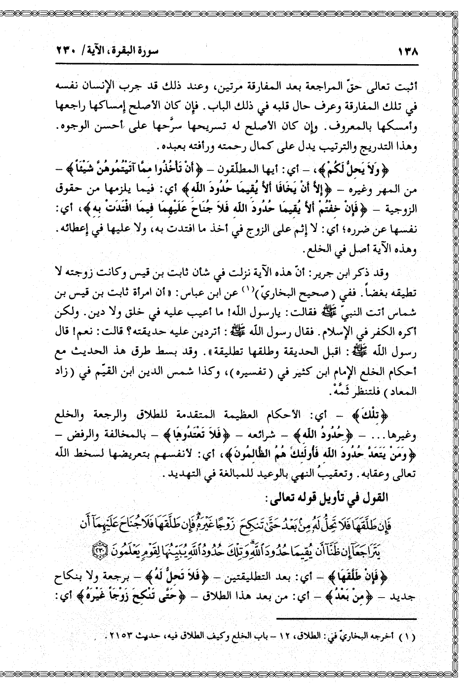 فَإِنْ طَلَّقَها فَلا تَحِلُّ لَهُ مِنْ بَعْدُ حَتَّى تَنْكِحَ زَوْجاً غَيْرَهُ فَإِنْ طَلَّقَها فَلا جُناحَ عَلَيْهِما أَنْ يَتَراجَعا إِنْ ظَنَّا أَنْ يُقِيما حُدُودَ اللَّهِ وَتِلْكَ حُدُودُ اللَّهِ يُبَيِّنُها لِقَوْمٍ يَعْلَمُونَ (230)