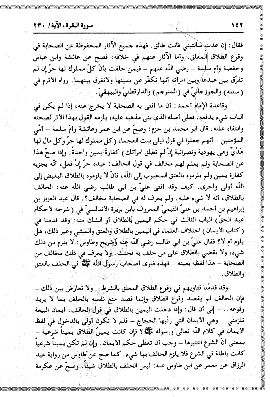فقال: إن عدت سألتيني فأنت طالق. فهذه جميع الآثار المحفوظة عن الصحابة في وقوع الطلاق المعلق. وأما الآثار عنهم في خلافه: فصح عن عائشة وابن عباس وحفصة وأم سلمة- رضي الله عنهم- فيمن حلفت بأنّ كلّ مملوك لها حرّ إن لم تفرّق بين عبدها وبين امرأته أنها تكفّر عن يمينها ولا تفرق بينهما. رواه الأثرم في (سننه) والجوز جانيّ في (المترجم) والدّارقطنيّ والبيهقيّ.