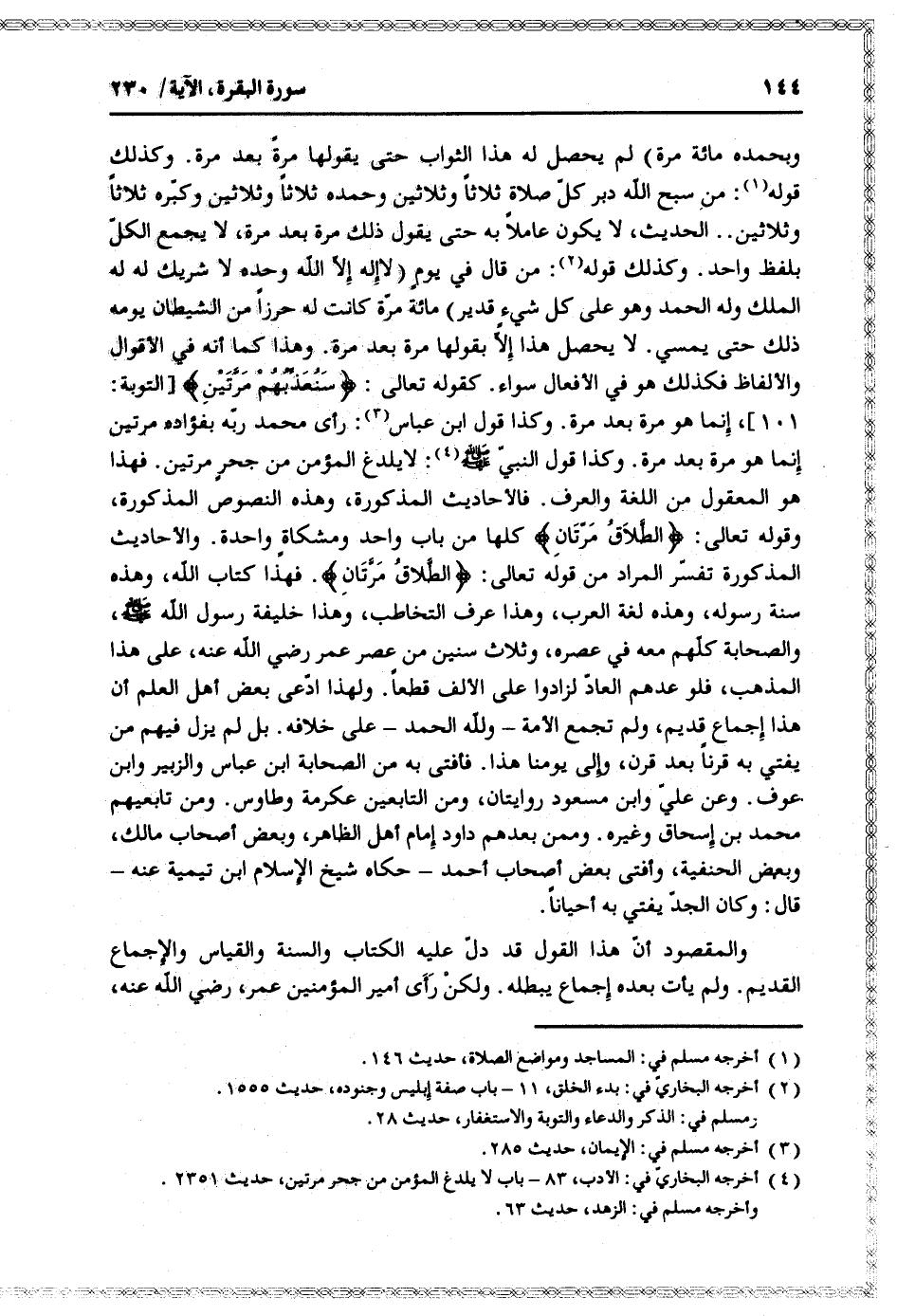 وبحمده مائة مرة) لم يحصل له هذا الثواب حتى يقولها مرة بعد مرة. وكذلك قوله «1» : من سبح الله دبر كلّ صلاة ثلاثا وثلاثين وحمده ثلاثا وثلاثين وكبّره ثلاثا وثلاثين. الحديث، لا يكون عاملا به حتى يقول ذلك مرة بعد مرة، لا يجمع الكلّ بلفظ واحد. وكذلك