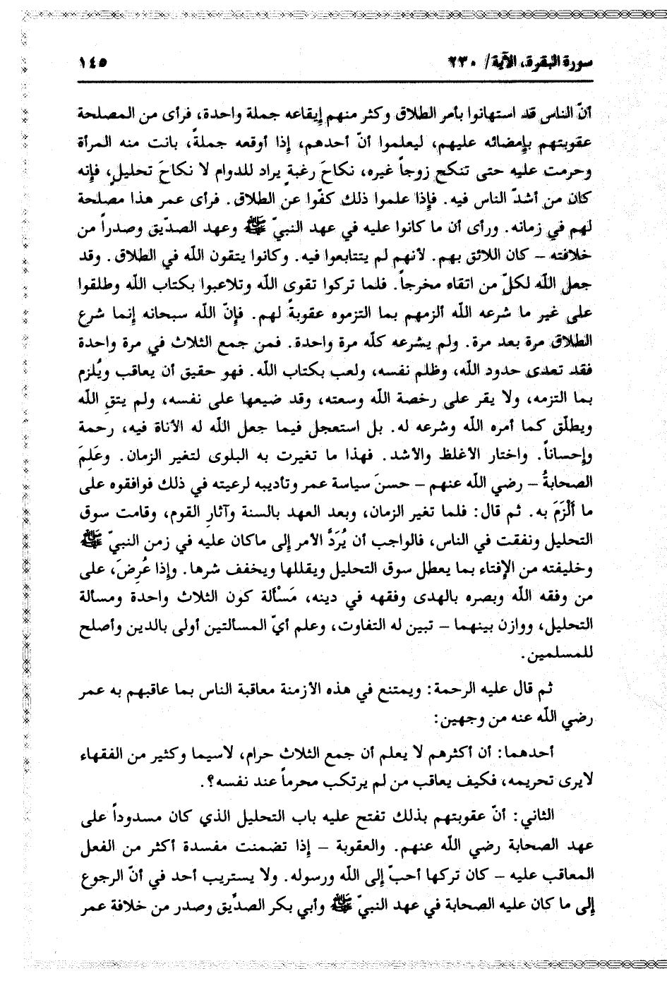 أنّ الناس قد استهانوا بأمر الطلاق وكثر منهم إيقاعه جملة واحدة، فرأى من المصلحة عقوبتهم بإمضائه عليهم، ليعلموا أنّ أحدهم، إذا أوقعه جملة، بانت منه المرأة وحرمت عليه حتى تنكح زوجا غيره، نكاح رغبة يراد للدوام لا نكاح تحليل، فإنه كان من أشدّ الناس فيه. فإذا علموا ذلك كفّوا عن الطلاق. فرأى عمر هذا مصلحة لهم في زمانه. ورأى أن ما كانوا عليه في عهد النبيّ صلّى الله عليه وسلم وعهد الصدّيق وصدرا من خلافته- كان اللائق بهم. لأنهم لم يتتابعوا فيه. وكانوا يتقون الله في الطلاق. وقد جعل الله لكلّ من اتقاه مخرجا. فلما تركوا تقوى الله وتلاعبوا بكتاب الله وطلقوا على غير ما شرعه الله ألزمهم بما التزموه عقوبة لهم. فإنّ الله سبحانه إنما شرع الطلاق مرة بعد مرة. ولم يشرعه كلّه مرة واحدة. فمن جمع الثلاث في مرة واحدة فقد تعدى حدود الله، وظلم نفسه، ولعب بكتاب الله. فهو حقيق أن يعاقب ويلزم بما التزمه، ولا يقر على رخصة الله وسعته، وقد ضيعها على نفسه، ولم يتق الله ويطلّق كما أمره الله وشرعه له. بل استعجل فيما جعل الله له الأناة فيه، رحمة وإحسانا. واختار الأغلظ والأشد. فهذا ما تغيرت به البلوى لتغير الزمان. وعلم الصحابة- رضي الله عنهم- حسن سياسة عمر وتأديبه لرعيته في ذلك فوافقوه على ما ألزم به. ثم قال: فلما تغير الزمان، وبعد العهد بالسنة وآثار القوم، وقامت سوق التحليل ونفقت في الناس، فالواجب أن يردّ الأمر إلى ما كان عليه في زمن النبيّ صلّى الله عليه وسلم وخليفته من الإفتاء بما يعطل سوق التحليل ويقللها ويخفف شرها. وإذا عرض، على من وفقه الله وبصره بالهدى وفقهه في دينه، مسألة كون الثلاث واحدة ومسألة التحليل، ووازن بينهما- تبين له التفاوت، وعلم أيّ المسألتين أولى بالدين وأصلح للمسلمين.