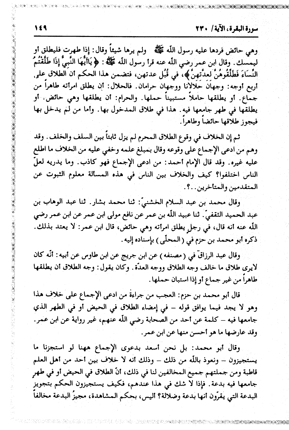 قال أبو محمد بن حزم: العجب من جراءة من ادعى الإجماع على خلاف هذا وهو لا يجد فيما يوافق قوله- في إمضاء الطلاق في الحيض أو في الطهر الذي جامعها فيه- كلمة عن أحد من الصحابة رضي الله عنهم، غير رواية عن ابن عمر.