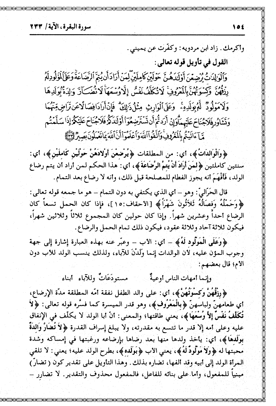 وَالْوالِداتُ يُرْضِعْنَ أَوْلادَهُنَّ حَوْلَيْنِ كامِلَيْنِ لِمَنْ أَرادَ أَنْ يُتِمَّ الرَّضاعَةَ وَعَلَى الْمَوْلُودِ لَهُ رِزْقُهُنَّ وَكِسْوَتُهُنَّ بِالْمَعْرُوفِ لا تُكَلَّفُ نَفْسٌ إِلاَّ وُسْعَها لا تُضَارَّ والِدَةٌ بِوَلَدِها وَلا مَوْلُودٌ لَهُ بِوَلَدِهِ وَعَلَى الْوارِثِ مِثْلُ ذلِكَ فَإِنْ أَرادا فِصالاً عَنْ تَراضٍ مِنْهُما وَتَشاوُرٍ فَلا جُناحَ عَلَيْهِما وَإِنْ أَرَدْتُمْ أَنْ تَسْتَرْضِعُوا أَوْلادَكُمْ فَلا جُناحَ عَلَيْكُمْ إِذا سَلَّمْتُمْ ما آتَيْتُمْ بِالْمَعْرُوفِ وَاتَّقُوا اللَّهَ وَاعْلَمُوا أَنَّ اللَّهَ بِما تَعْمَلُونَ بَصِيرٌ (233)