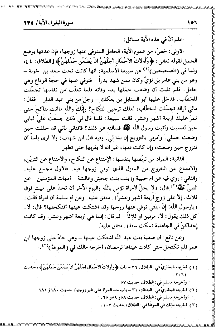 الأولى: خصّ، من عموم الآية، الحامل المتوفى عنها زوجها، فإن عدتها بوضع الحمل لقوله تعالى: وَأُولاتُ الْأَحْمالِ أَجَلُهُنَّ أَنْ يَضَعْنَ حَمْلَهُنَّ [الطلاق: 4] ، ولما في (الصحيحين) «1» عن سبيعة الأسلمية: أنها كانت تحت سعد بن خولة- وهو من بني عامر بن لؤيّ وكان ممن شهد بدرا- فتوفي عنها في حجة الوداع وهي حامل. فلم تلبث أن وضعت حملها بعد وفاته فلما تعلّت من نفاسها تجمّلت للخطّاب. فدخل عليها أبو السنابل بن بعكك- رجل من بني عبد الدار- فقال: