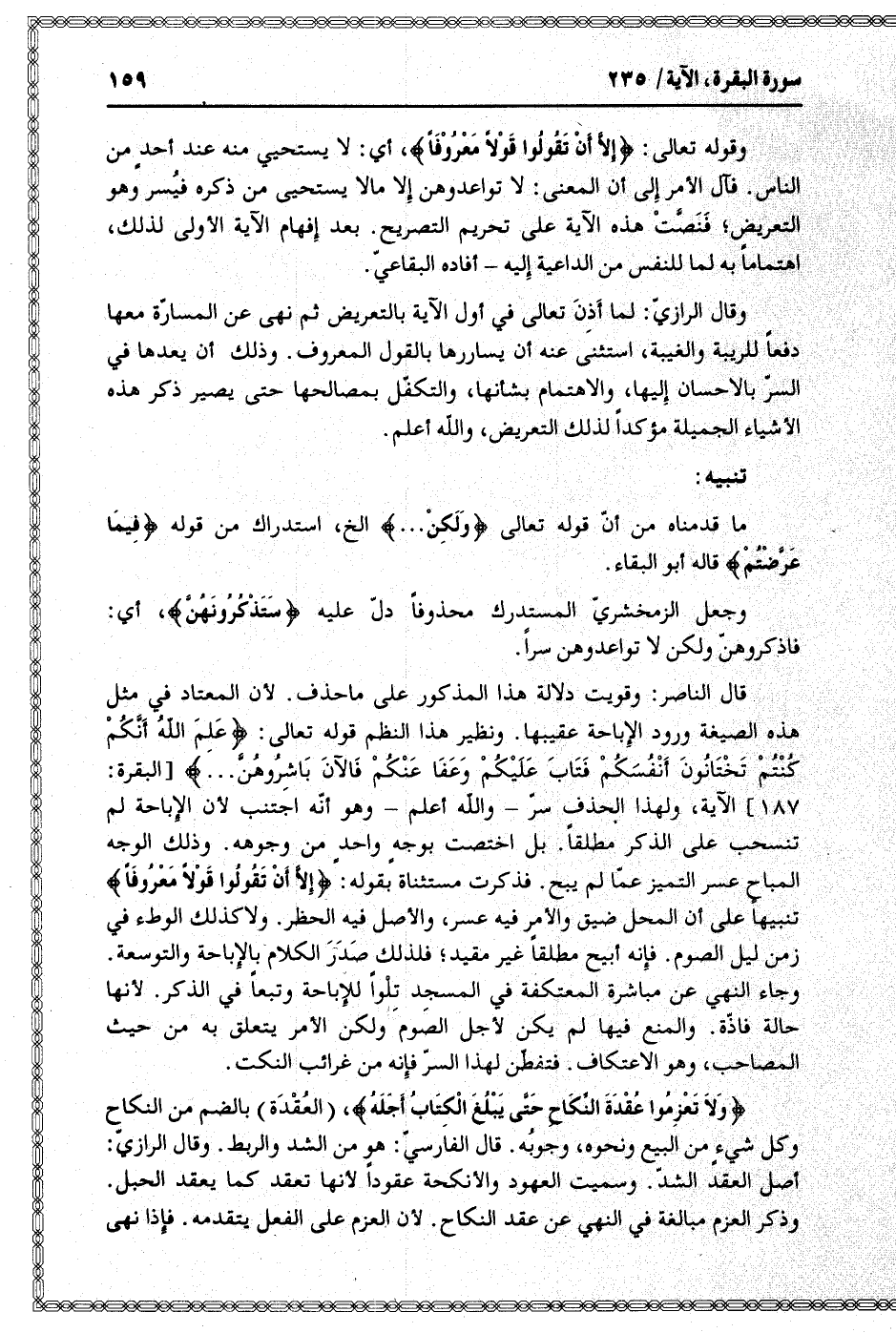 وقال الرازيّ: لما أذن تعالى في أول الآية بالتعريض ثم نهى عن المسارّة معها دفعا للريبة والغيبة، استثنى عنه أن يساررها بالقول المعروف. وذلك أن يعدها في السرّ بالإحسان إليها، والاهتمام بشأنها، والتكفّل بمصالحها حتى يصير ذكر هذه الأشياء الجميلة مؤكدا لذلك التعريض، والله أعلم.