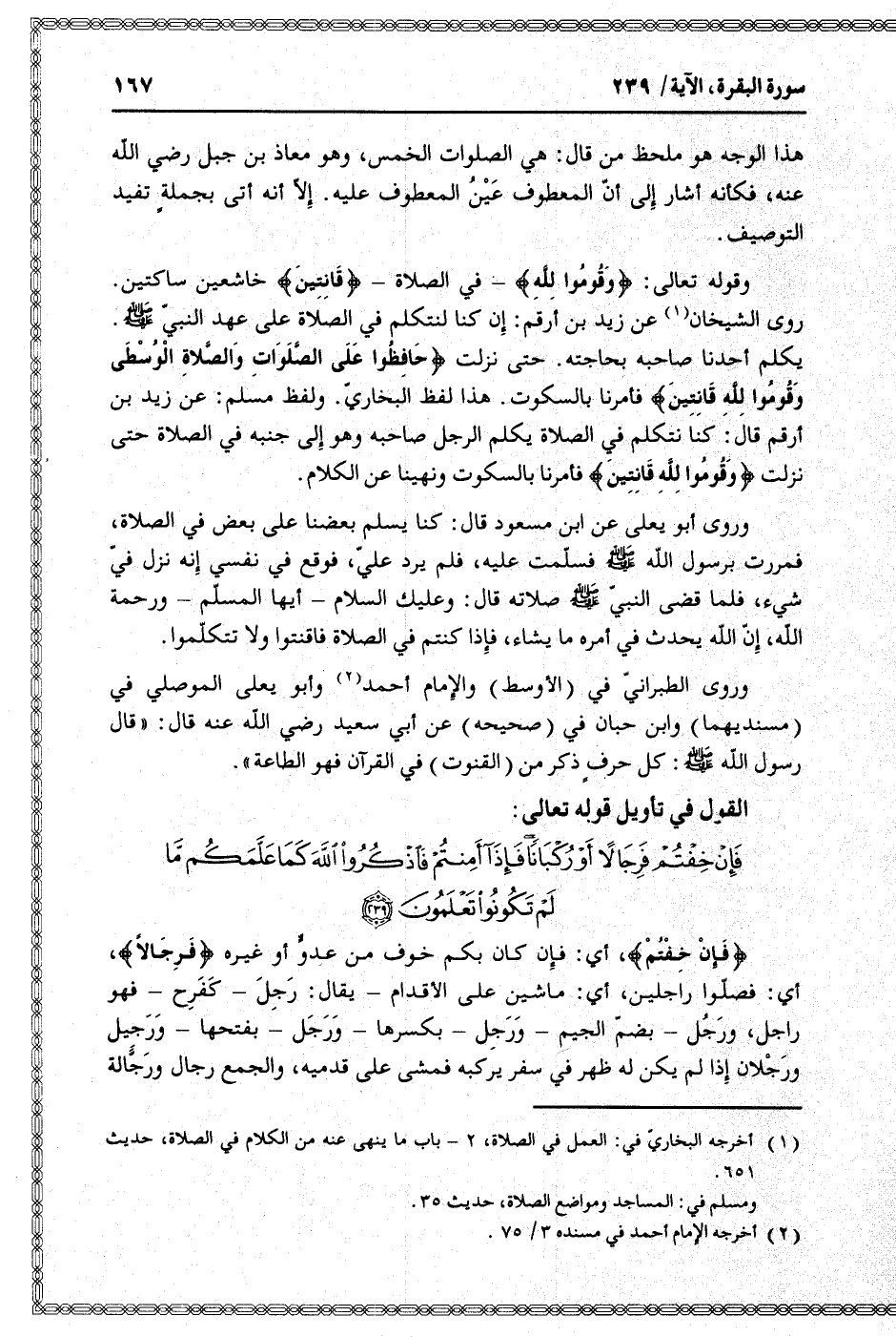 يكلم أحدنا صاحبه بحاجته. حتى نزلت حافِظُوا عَلَى الصَّلَواتِ وَالصَّلاةِ الْوُسْطى وَقُومُوا لِلَّهِ قانِتِينَ فأمرنا بالسكوت. هذا لفظ البخاريّ. ولفظ مسلم: عن زيد بن أرقم قال: كنا نتكلم في الصلاة يكلم الرجل صاحبه وهو إلى جنبه في الصلاة حتى نزلت وَقُومُوا لِلَّهِ قانِتِينَ فأمرنا بالسكوت ونهينا عن الكلام.
