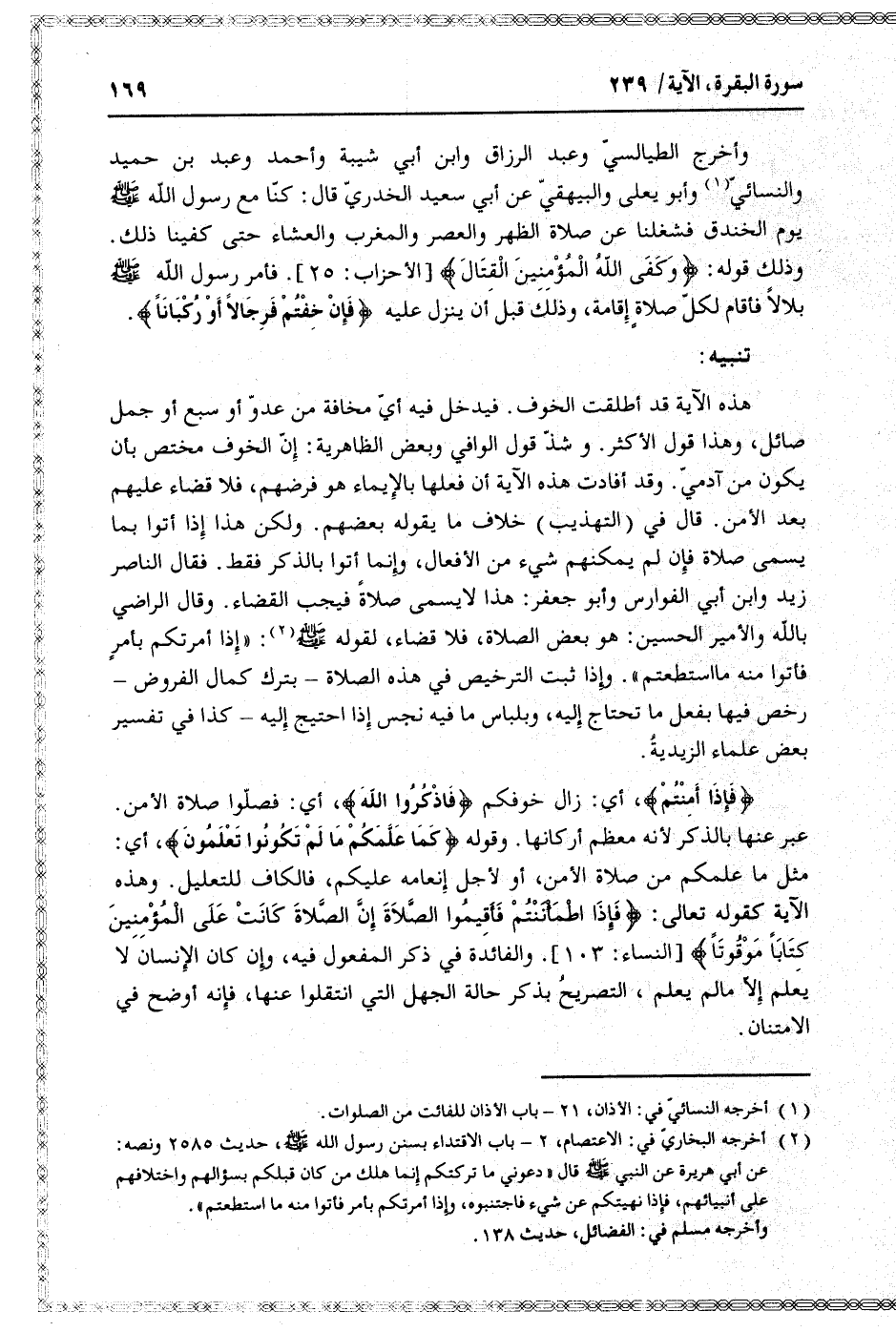 هذه الآية قد أطلقت الخوف. فيدخل فيه أيّ مخافة من عدوّ أو سبع أو جمل صائل، وهذا قول الأكثر. وشذّ قول الوافي وبعض الظاهرية: إنّ الخوف مختص بأن يكون من آدميّ. وقد أفادت هذه الآية أن فعلها بالإيماء هو فرضهم، فلا قضاء عليهم بعد الأمن. قال في (التهذيب) خلاف ما يقوله بعضهم. ولكن هذا إذا أتوا بما يسمى صلاة فإن لم يمكنهم شيء من الأفعال، وإنما أتوا بالذكر فقط. فقال الناصر زيد وابن أبي الفوارس وأبو جعفر: هذا لا يسمى صلاة فيجب القضاء. وقال الراضي بالله والأمير الحسين: هو بعض الصلاة، فلا قضاء،