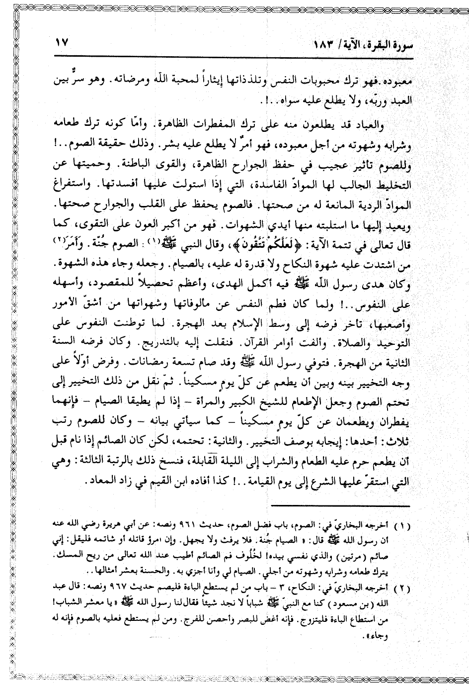 وكان هدى رسول الله صلّى الله عليه وسلّم فيه أكمل الهدى، وأعظم تحصيلا للمقصود، وأسهله على النفوس..! ولما كان فطم النفس عن مألوفاتها وشهواتها من أشقّ الأمور وأصعبها، تأخر فرضه إلى وسط الإسلام بعد الهجرة. لما توطنت النفوس على التوحيد والصلاة. وألفت أوامر القرآن. فنقلت إليه بالتدريج. وكان فرضه السنة الثانية من الهجرة. فتوفي رسول الله صلّى الله عليه وسلّم وقد صام تسعة رمضانات. وفرض أوّلا على وجه التخيير بينه وبين أن يطعم عن كلّ يوم مسكينا. ثمّ نقل من ذلك التخيير إلى تحتم الصوم وجعل الإطعام للشيخ الكبير والمرأة- إذا لم يطيقا الصيام- فإنهما يفطران ويطعمان عن كلّ يوم مسكينا- كما سيأتي بيانه- وكان للصوم رتب ثلاث: أحدها: إيجابه بوصف التخيير. والثانية: تحتمه، لكن كان الصائم إذا نام قبل أن يطعم حرم عليه الطعام والشراب إلى الليلة القابلة، فنسخ ذلك بالرتبة الثالثة: وهي التي استقرّ عليها الشرع إلى يوم القيامة..! كذا أفاده ابن القيم في زاد المعاد.