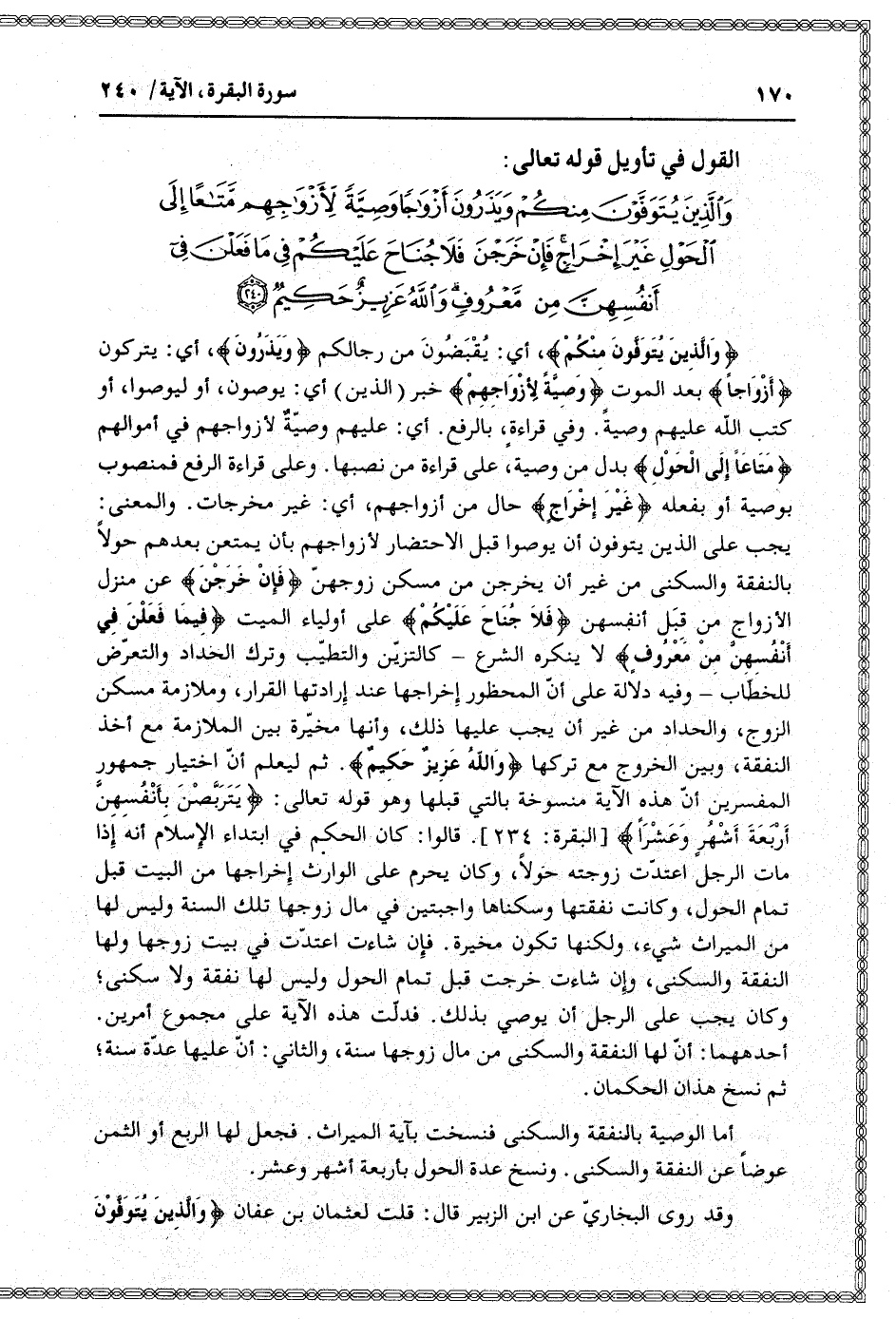 وَالَّذِينَ يُتَوَفَّوْنَ مِنْكُمْ وَيَذَرُونَ أَزْواجاً وَصِيَّةً لِأَزْواجِهِمْ مَتاعاً إِلَى الْحَوْلِ غَيْرَ إِخْراجٍ فَإِنْ خَرَجْنَ فَلا جُناحَ عَلَيْكُمْ فِي ما فَعَلْنَ فِي أَنْفُسِهِنَّ مِنْ مَعْرُوفٍ وَاللَّهُ عَزِيزٌ حَكِيمٌ (240)