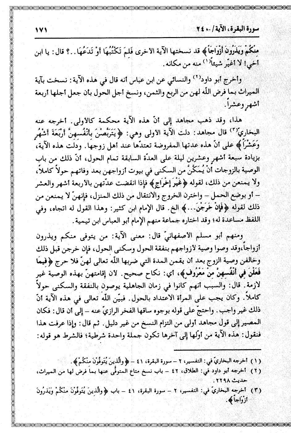 (3) أخرجه البخاريّ في: التفسير، 2- سورة البقرة، 41- باب وَالَّذِينَ يُتَوَفَّوْنَ مِنْكُمْ وَيَذَرُونَ أَزْواجاً.