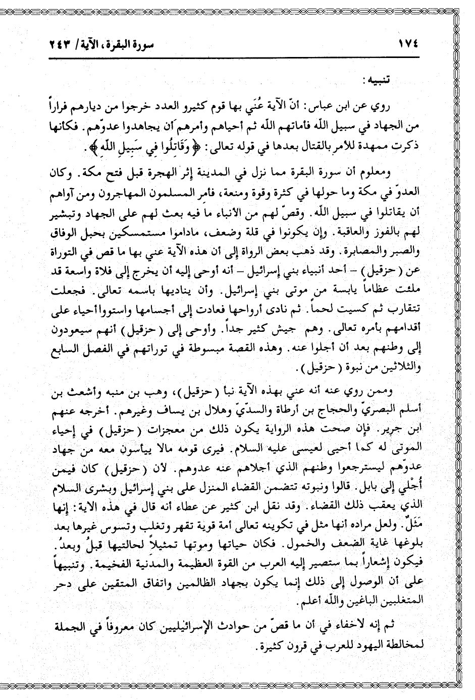 ومعلوم أن سورة البقرة مما نزل في المدينة إثر الهجرة قبل فتح مكة. وكان العدوّ في مكة وما حولها في كثرة وقوة ومنعة، فأمر المسلمون المهاجرون ومن آواهم أن يقاتلوا في سبيل الله. وقصّ لهم من الأنباء ما فيه بعث لهم على الجهاد وتبشير لهم بالفوز والعاقبة. وإن يكونوا في قلة وضعف، ما داموا مستمسكين بحبل الوفاق والصبر والمصابرة. وقد ذهب بعض الرواة إلى أن هذه الآية عني بها ما قص في التوراة عن (حزقيل) - أحد أنبياء بني إسرائيل- أنه أوحى إليه أن يخرج إلى فلاة واسعة قد ملئت عظاما يابسة من موتى بني إسرائيل. وأن يناديها باسمه تعالى. فجعلت تتقارب ثم كسيت لحما. ثم نادى أرواحها فعادت إلى أجسامها واستووا أحياء على أقدامهم بأمره تعالى. وهم جيش كثير جدا. وأوحى إلى (حزقيل) أنهم سيعودون إلى وطنهم بعد أن أجلوا عنه. وهذه القصة مبسوطة في توراتهم في الفصل السابع والثلاثين من نبوة (حزقيل) .