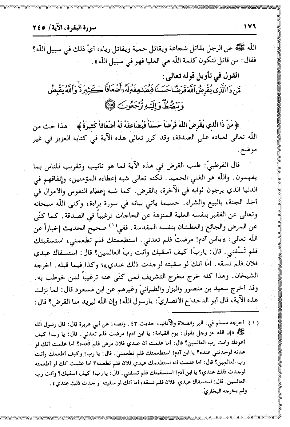 مَنْ ذَا الَّذِي يُقْرِضُ اللَّهَ قَرْضاً حَسَناً فَيُضاعِفَهُ لَهُ أَضْعافاً كَثِيرَةً وَاللَّهُ يَقْبِضُ وَيَبْصُطُ وَإِلَيْهِ تُرْجَعُونَ (245)