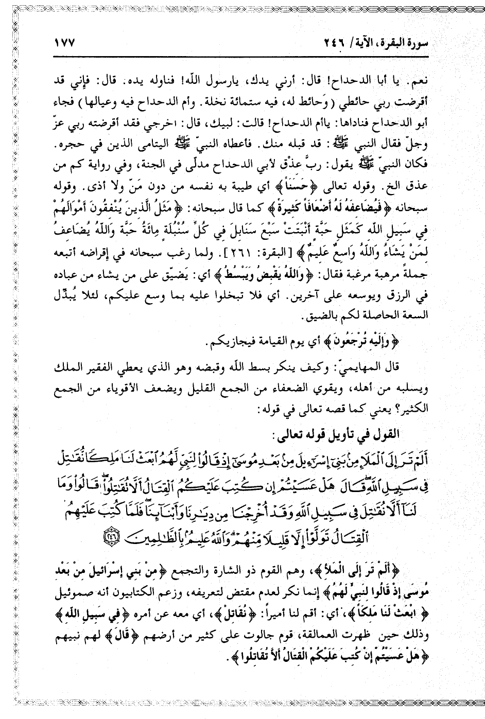 أَلَمْ تَرَ إِلَى الْمَلَإِ مِنْ بَنِي إِسْرائِيلَ مِنْ بَعْدِ مُوسى إِذْ قالُوا لِنَبِيٍّ لَهُمُ ابْعَثْ لَنا مَلِكاً نُقاتِلْ فِي سَبِيلِ اللَّهِ قالَ هَلْ عَسَيْتُمْ إِنْ كُتِبَ عَلَيْكُمُ الْقِتالُ أَلاَّ تُقاتِلُوا قالُوا وَما لَنا أَلاَّ نُقاتِلَ فِي سَبِيلِ اللَّهِ وَقَدْ أُخْرِجْنا مِنْ دِيارِنا وَأَبْنائِنا فَلَمَّا كُتِبَ عَلَيْهِمُ الْقِتالُ تَوَلَّوْا إِلاَّ قَلِيلاً مِنْهُمْ وَاللَّهُ عَلِيمٌ بِالظَّالِمِينَ (246)