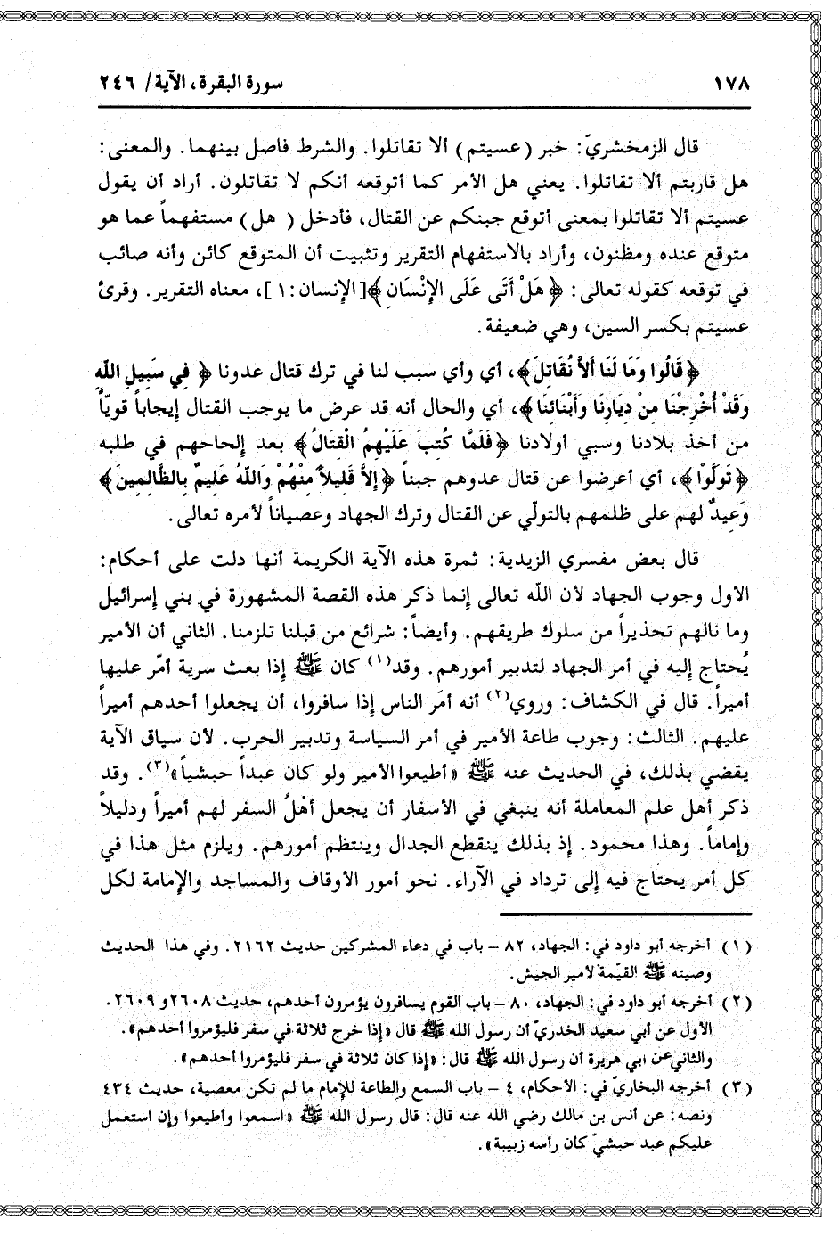 الأول وجوب الجهاد لأن الله تعالى إنما ذكر هذه القصة المشهورة في بني إسرائيل وما نالهم تحذيرا من سلوك طريقهم. وأيضا: شرائع من قبلنا تلزمنا. الثاني أن الأمير يحتاج إليه في أمر الجهاد لتدبير أمورهم. وقد «1» كان صلّى الله عليه وسلم إذا بعث سرية أمّر عليها أميرا. قال في الكشاف: وروي «2» أنه أمر الناس إذا سافروا، أن يجعلوا أحدهم أميرا عليهم. الثالث: وجوب طاعة الأمير في أمر السياسة وتدبير الحرب. لأن سياق الآية يقضي بذلك،