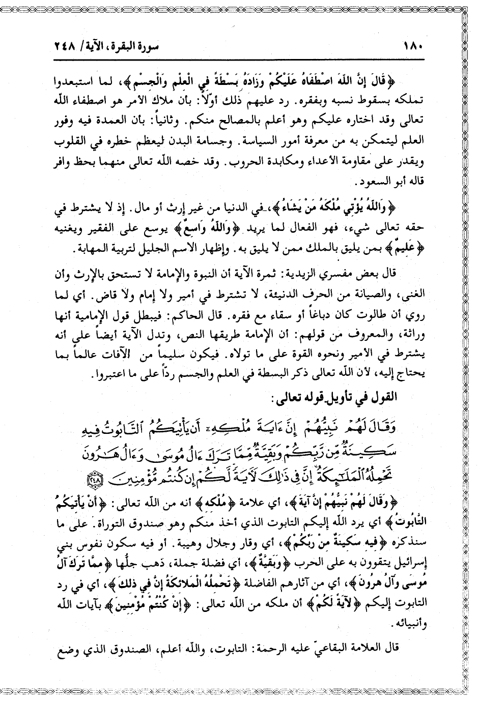 وَقالَ لَهُمْ نَبِيُّهُمْ إِنَّ آيَةَ، أي علامة مُلْكِهِ أنه من الله تعالى: أَنْ يَأْتِيَكُمُ التَّابُوتُ أي يرد الله إليكم التابوت الذي أخذ منكم وهو صندوق التوراة. على ما سنذكره فِيهِ سَكِينَةٌ مِنْ رَبِّكُمْ، أي وقار وجلال وهيبة. أو فيه سكون نفوس بني إسرائيل يتقوون به على الحرب وَبَقِيَّةٌ، أي فضلة جملة، ذهب جلّها مِمَّا تَرَكَ آلُ مُوسى وَآلُ هارُونَ، أي من آثارهم الفاضلة تَحْمِلُهُ الْمَلائِكَةُ إِنَّ فِي ذلِكَ، أي في رد التابوت إليكم لَآيَةً لَكُمْ أن ملكه من الله تعالى: إِنْ كُنْتُمْ مُؤْمِنِينَ بآيات الله وأنبيائه.