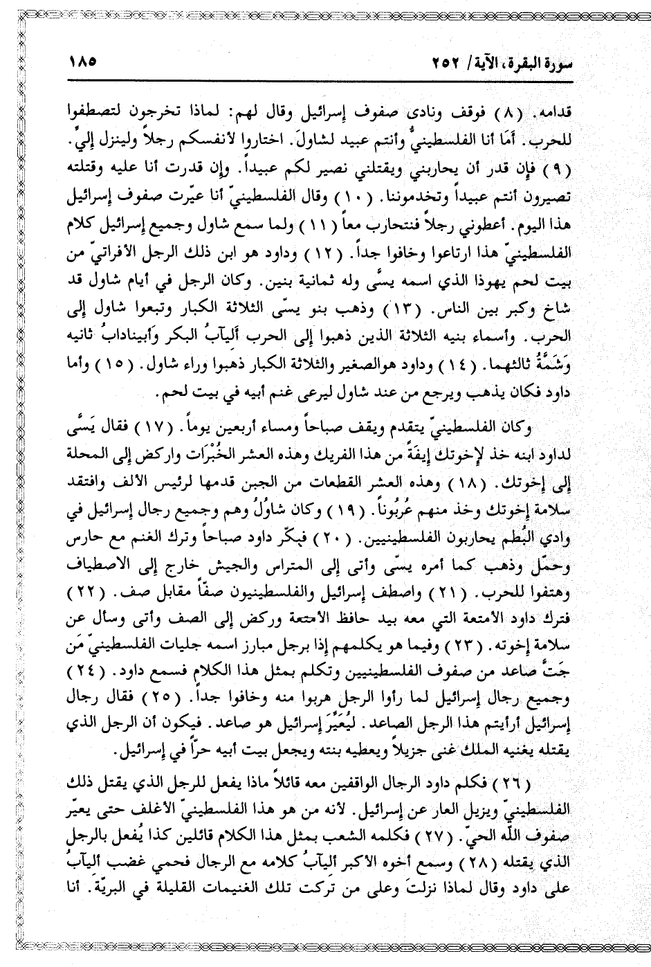 وكان الفلسطينيّ يتقدم ويقف صباحا ومساء أربعين يوما. (17) فقال يسّى لداود ابنه خذ لإخوتك إيفة من هذا الفريك وهذه العشر الخبرات واركض إلى المحلة إلى إخوتك. (18) وهذه العشر القطعات من الجبن قدمها لرئيس الألف وافتقد سلامة إخوتك وخذ منهم عربونا. (19) وكان شاول وهم وجميع رجال إسرائيل في وادي البطم يحاربون الفلسطينيين. (20) فبكّر داود صباحا وترك الغنم مع حارس وحمّل وذهب كما أمره يسّى وأتى إلى المتراس والجيش خارج إلى الاصطياف وهتفوا للحرب. (21) واصطف إسرائيل والفلسطينيون صفّا مقابل صف. (22)