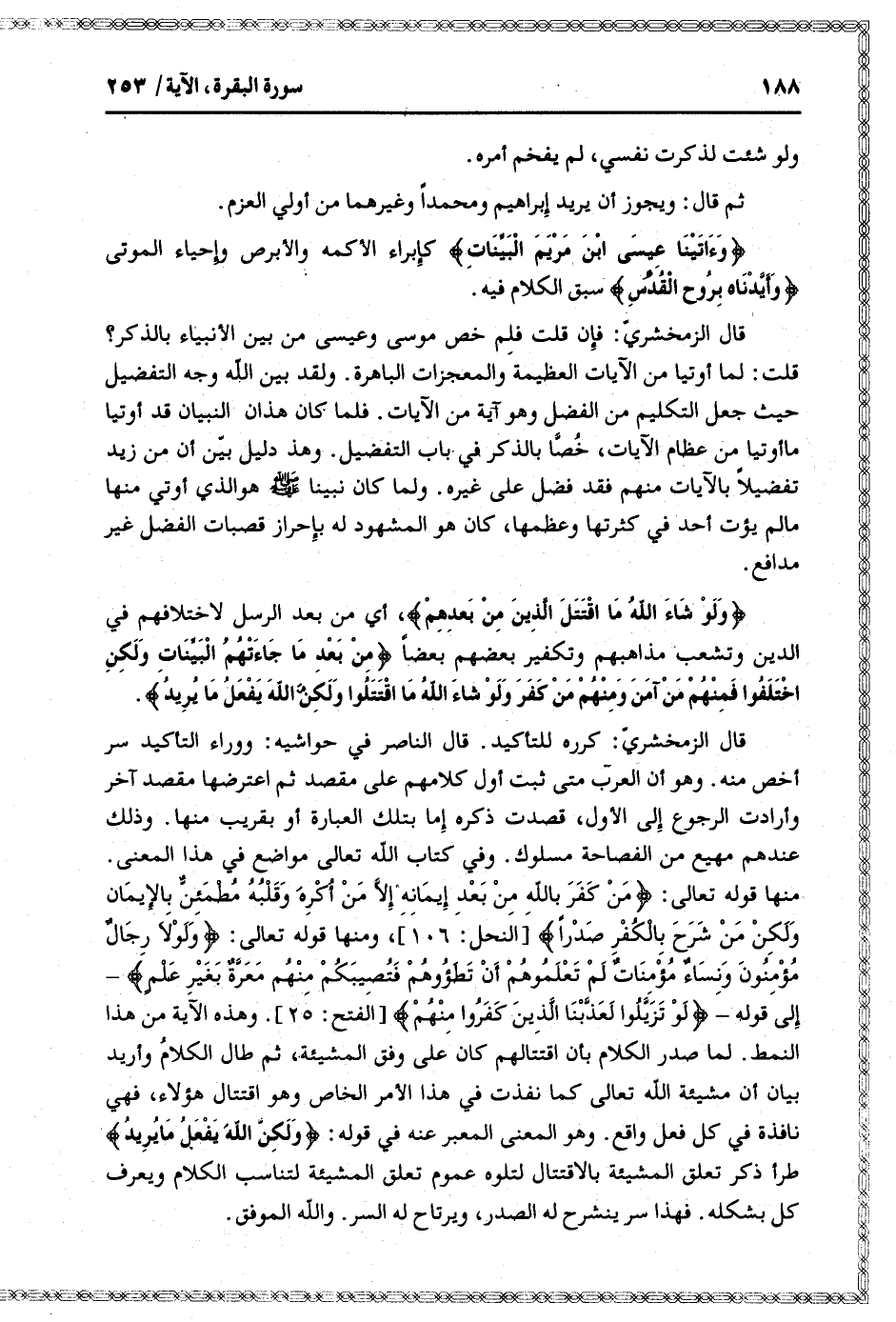 منها قوله تعالى: مَنْ كَفَرَ بِاللَّهِ مِنْ بَعْدِ إِيمانِهِ إِلَّا مَنْ أُكْرِهَ وَقَلْبُهُ مُطْمَئِنٌّ بِالْإِيمانِ وَلكِنْ مَنْ شَرَحَ بِالْكُفْرِ صَدْراً [النحل: 106] ، ومنها قوله تعالى: وَلَوْلا رِجالٌ مُؤْمِنُونَ وَنِساءٌ مُؤْمِناتٌ لَمْ تَعْلَمُوهُمْ أَنْ تَطَؤُهُمْ فَتُصِيبَكُمْ مِنْهُمْ مَعَرَّةٌ بِغَيْرِ عِلْمٍ- إلى قوله- لَوْ تَزَيَّلُوا لَعَذَّبْنَا الَّذِينَ كَفَرُوا مِنْهُمْ [الفتح: 25] . وهذه الآية من هذا النمط. لما صدر الكلام بأن اقتتالهم كان على وفق المشيئة، ثم طال الكلام وأريد بيان أن مشيئة الله تعالى كما نفذت في هذا الأمر الخاص وهو اقتتال هؤلاء، فهي نافذة في كل فعل واقع. وهو المعنى المعبر عنه في قوله: وَلكِنَّ اللَّهَ يَفْعَلُ ما يُرِيدُ طرأ ذكر تعلق المشيئة بالاقتتال لتلوه عموم تعلق المشيئة لتناسب الكلام ويعرف كل بشكله. فهذا سر ينشرح له الصدر، ويرتاح له السر. والله الموفق.