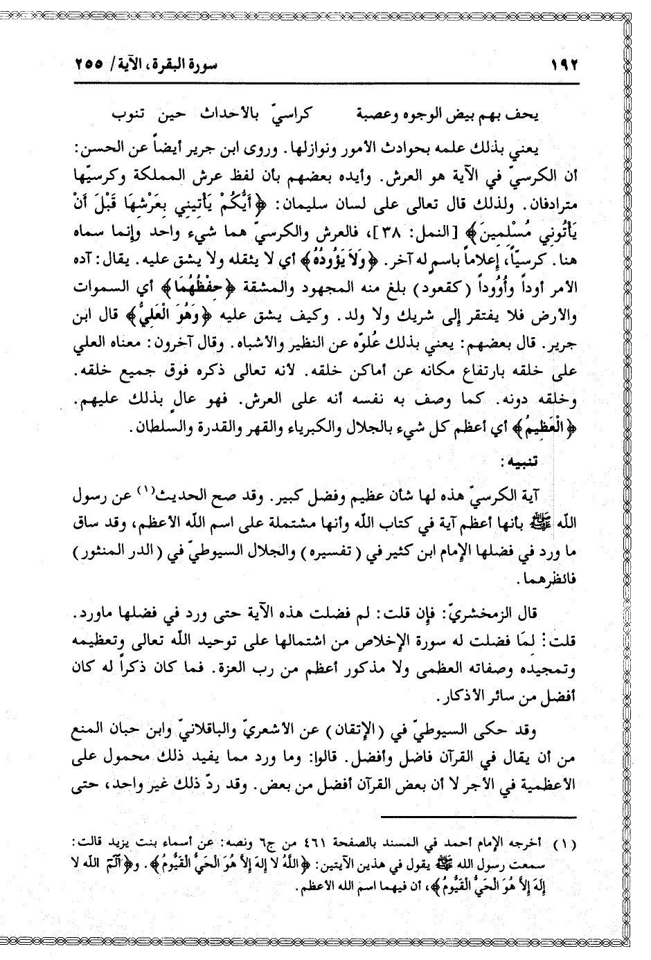 أن الكرسيّ في الآية هو العرش. وأيده بعضهم بأن لفظ عرش المملكة وكرسيّها مترادفان. ولذلك قال تعالى على لسان سليمان: أَيُّكُمْ يَأْتِينِي بِعَرْشِها قَبْلَ أَنْ يَأْتُونِي مُسْلِمِينَ [النمل: 38] ، فالعرش والكرسيّ هما شيء واحد وإنما سماه هنا. كرسيّا، إعلاما باسم له آخر. وَلا يَؤُدُهُ أي لا يثقله ولا يشق عليه. يقال: آده الأمر أودا وأوودا (كقعود) بلغ منه المجهود والمشقة حِفْظُهُما أي السموات والأرض فلا يفتقر إلى شريك ولا ولد. وكيف يشق عليه وَهُوَ الْعَلِيُّ قال ابن جرير. قال بعضهم: يعني بذلك علوّه عن النظير والأشباه. وقال آخرون: معناه العلي على خلقه بارتفاع مكانه عن أماكن خلقه. لأنه تعالى ذكره فوق جميع خلقه.