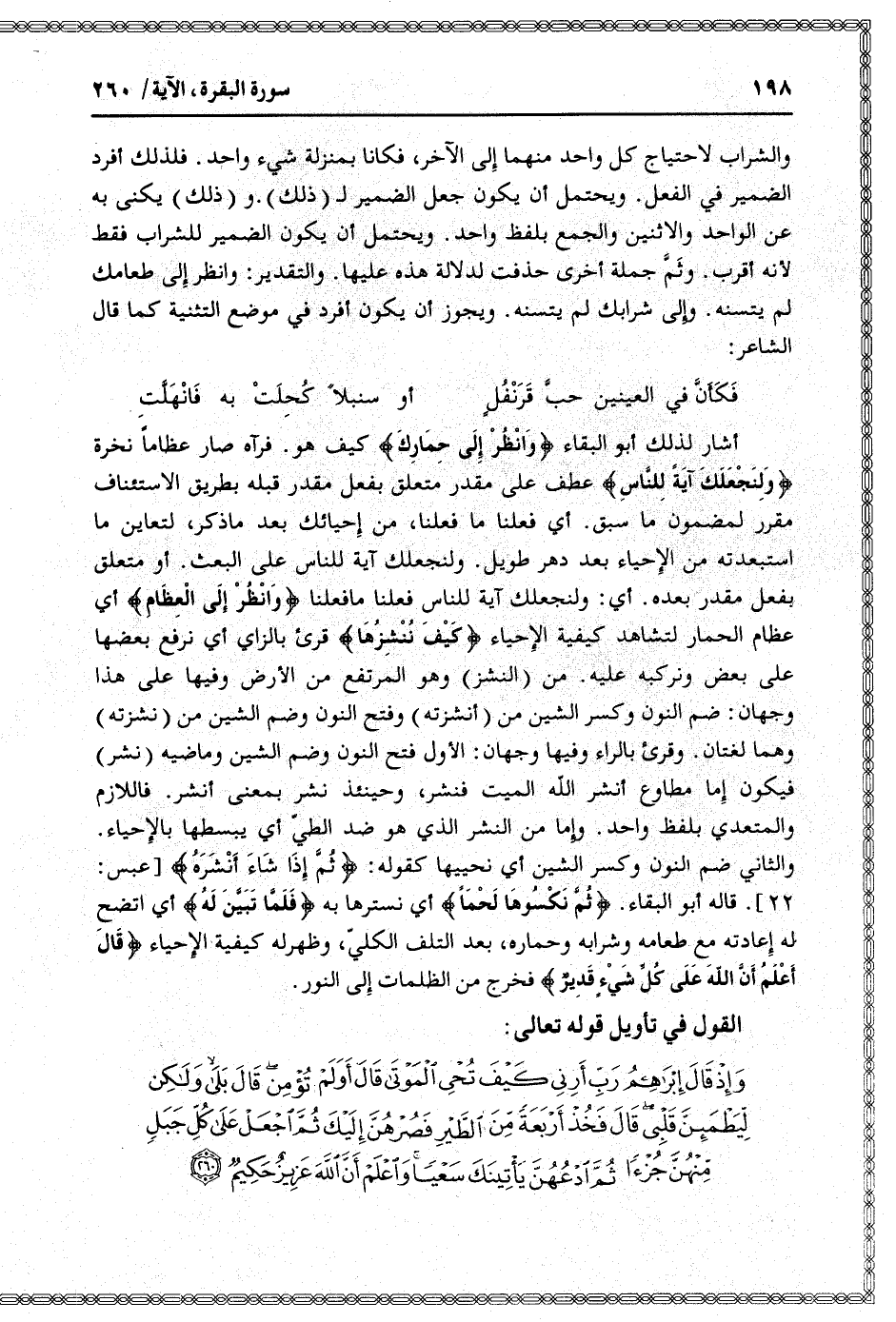 22] . قاله أبو البقاء. ثُمَّ نَكْسُوها لَحْماً أي نسترها به فَلَمَّا تَبَيَّنَ لَهُ أي اتضح له إعادته مع طعامه وشرابه وحماره، بعد التلف الكليّ، وظهر له كيفية الإحياء قالَ أَعْلَمُ أَنَّ اللَّهَ عَلى كُلِّ شَيْءٍ قَدِيرٌ فخرج من الظلمات إلى النور.