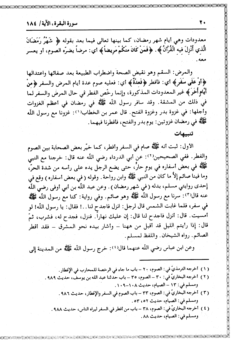 والمرض: السقم وهو نقيض الصحة واضطراب الطبيعة بعد صفائها واعتدالها أَوْ عَلى سَفَرٍ أي: فأفطر فَعِدَّةٌ أي: فعليه صوم عدة أيام المرض والسفر مِنْ أَيَّامٍ أُخَرَ غير المعدودات المذكورة، وإنما رخّص الفطر في حال المرض والسفر لما في ذلك من المشقة. وقد سافر رسول الله صلّى الله عليه وسلّم في رمضان في أعظم الغزوات وأجلها: في غزوة بدر وغزوة الفتح.