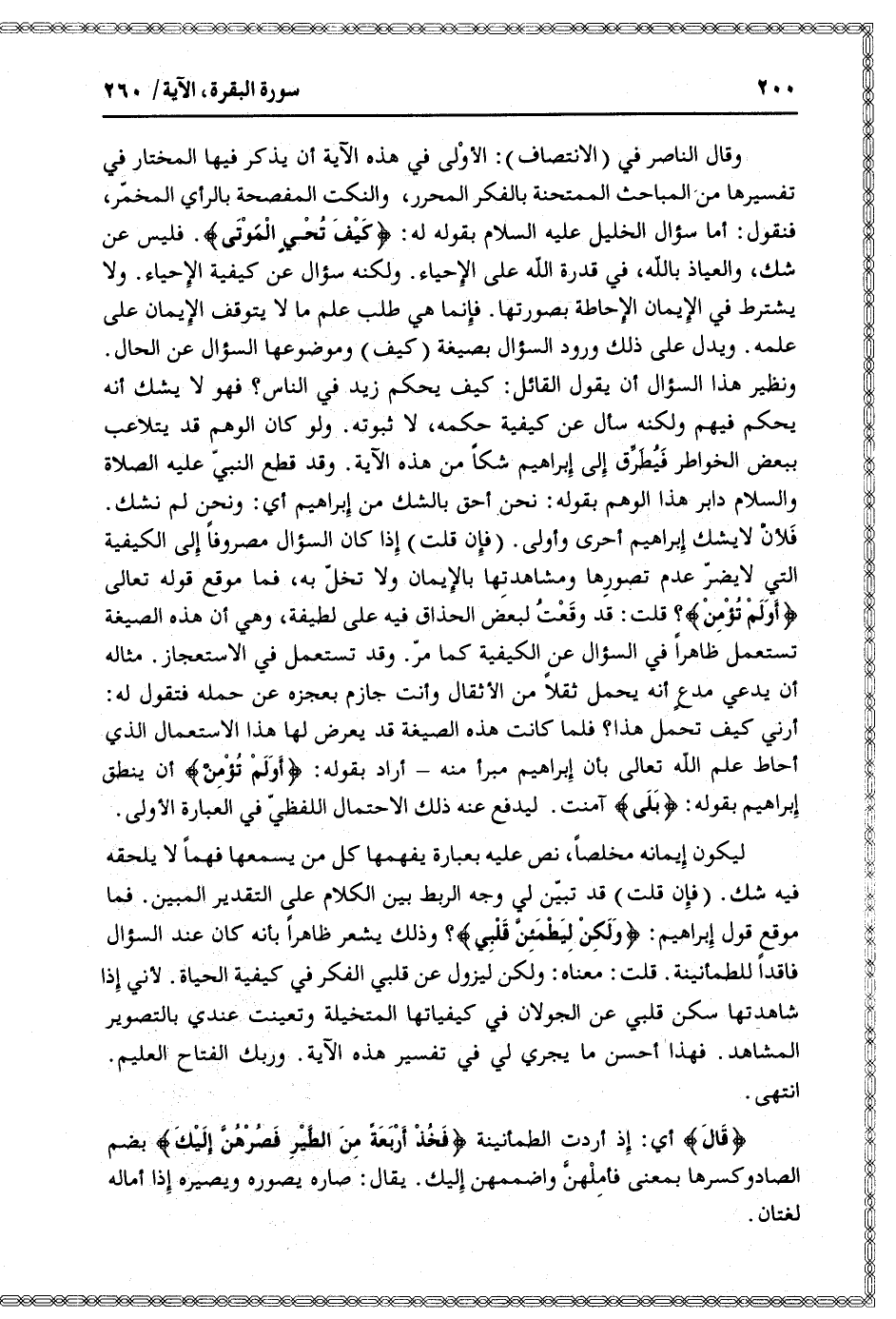 وقال الناصر في (الانتصاف) : الأولى في هذه الآية أن يذكر فيها المختار في تفسيرها من المباحث الممتحنة بالفكر المحرر، والنكت المفصحة بالرأي المخمّر، فنقول: أما سؤال الخليل عليه السلام بقوله له: كَيْفَ تُحْيِ الْمَوْتى. فليس عن شك، والعياذ بالله، في قدرة الله على الإحياء. ولكنه سؤال عن كيفية الإحياء. ولا يشترط في الإيمان الإحاطة بصورتها. فإنما هي طلب علم ما لا يتوقف الإيمان على علمه. ويدل على ذلك ورود السؤال بصيغة (كيف) وموضوعها السؤال عن الحال.