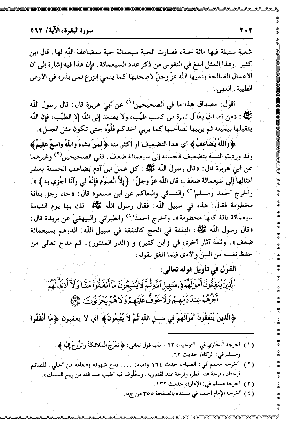 الَّذِينَ يُنْفِقُونَ أَمْوالَهُمْ فِي سَبِيلِ اللَّهِ ثُمَّ لا يُتْبِعُونَ ما أَنْفَقُوا مَنًّا وَلا أَذىً لَهُمْ أَجْرُهُمْ عِنْدَ رَبِّهِمْ وَلا خَوْفٌ عَلَيْهِمْ وَلا هُمْ يَحْزَنُونَ (262)