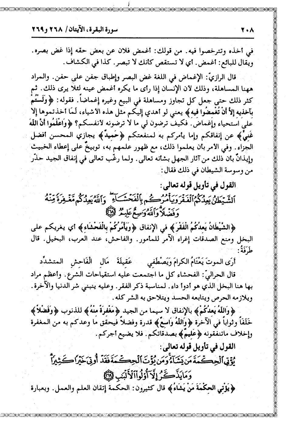 الشَّيْطانُ يَعِدُكُمُ الْفَقْرَ وَيَأْمُرُكُمْ بِالْفَحْشاءِ وَاللَّهُ يَعِدُكُمْ مَغْفِرَةً مِنْهُ وَفَضْلاً وَاللَّهُ واسِعٌ عَلِيمٌ (268)