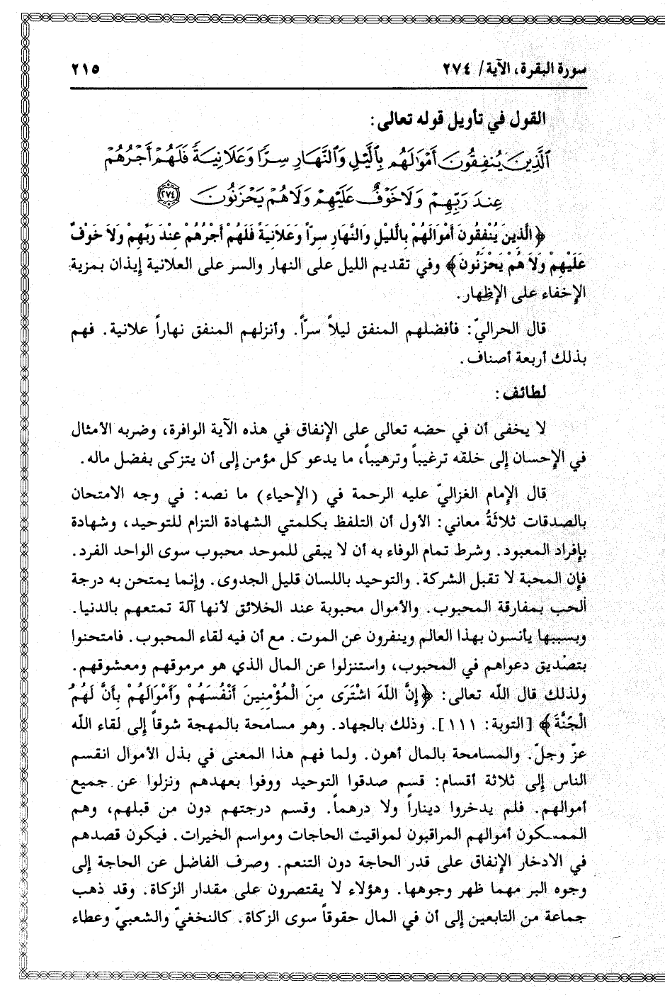 الَّذِينَ يُنْفِقُونَ أَمْوالَهُمْ بِاللَّيْلِ وَالنَّهارِ سِرًّا وَعَلانِيَةً فَلَهُمْ أَجْرُهُمْ عِنْدَ رَبِّهِمْ وَلا خَوْفٌ عَلَيْهِمْ وَلا هُمْ يَحْزَنُونَ (274)
