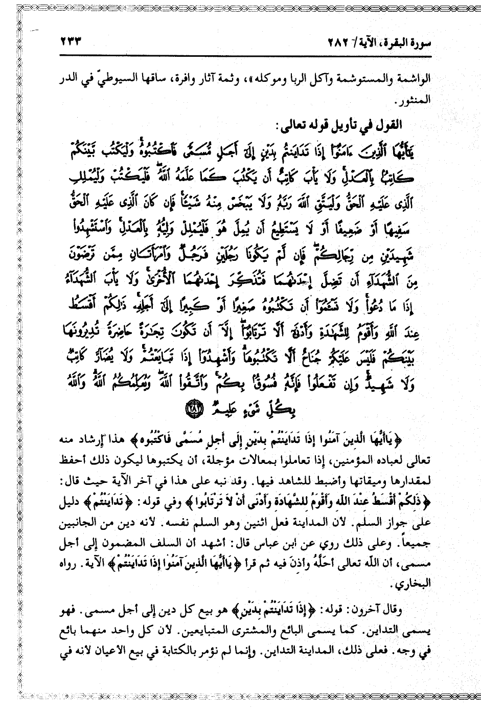 يا أَيُّهَا الَّذِينَ آمَنُوا إِذا تَدايَنْتُمْ بِدَيْنٍ إِلى أَجَلٍ مُسَمًّى فَاكْتُبُوهُ وَلْيَكْتُبْ بَيْنَكُمْ كاتِبٌ بِالْعَدْلِ وَلا يَأْبَ كاتِبٌ أَنْ يَكْتُبَ كَما عَلَّمَهُ اللَّهُ فَلْيَكْتُبْ وَلْيُمْلِلِ الَّذِي عَلَيْهِ الْحَقُّ وَلْيَتَّقِ اللَّهَ رَبَّهُ وَلا يَبْخَسْ مِنْهُ شَيْئاً فَإِنْ كانَ الَّذِي عَلَيْهِ الْحَقُّ سَفِيهاً أَوْ ضَعِيفاً أَوْ لا يَسْتَطِيعُ أَنْ يُمِلَّ هُوَ فَلْيُمْلِلْ وَلِيُّهُ بِالْعَدْلِ وَاسْتَشْهِدُوا شَهِيدَيْنِ مِنْ رِجالِكُمْ فَإِنْ لَمْ يَكُونا رَجُلَيْنِ فَرَجُلٌ وَامْرَأَتانِ مِمَّنْ تَرْضَوْنَ مِنَ الشُّهَداءِ أَنْ تَضِلَّ إِحْداهُما فَتُذَكِّرَ إِحْداهُمَا الْأُخْرى وَلا يَأْبَ الشُّهَداءُ إِذا ما دُعُوا وَلا تَسْئَمُوا أَنْ تَكْتُبُوهُ صَغِيراً أَوْ كَبِيراً إِلى أَجَلِهِ ذلِكُمْ أَقْسَطُ عِنْدَ اللَّهِ وَأَقْوَمُ لِلشَّهادَةِ وَأَدْنى أَلاَّ تَرْتابُوا إِلاَّ أَنْ تَكُونَ تِجارَةً حاضِرَةً تُدِيرُونَها بَيْنَكُمْ فَلَيْسَ عَلَيْكُمْ جُناحٌ أَلاَّ تَكْتُبُوها وَأَشْهِدُوا إِذا تَبايَعْتُمْ وَلا يُضَارَّ كاتِبٌ وَلا شَهِيدٌ وَإِنْ تَفْعَلُوا فَإِنَّهُ فُسُوقٌ بِكُمْ وَاتَّقُوا اللَّهَ وَيُعَلِّمُكُمُ اللَّهُ وَاللَّهُ بِكُلِّ شَيْءٍ عَلِيمٌ (282)