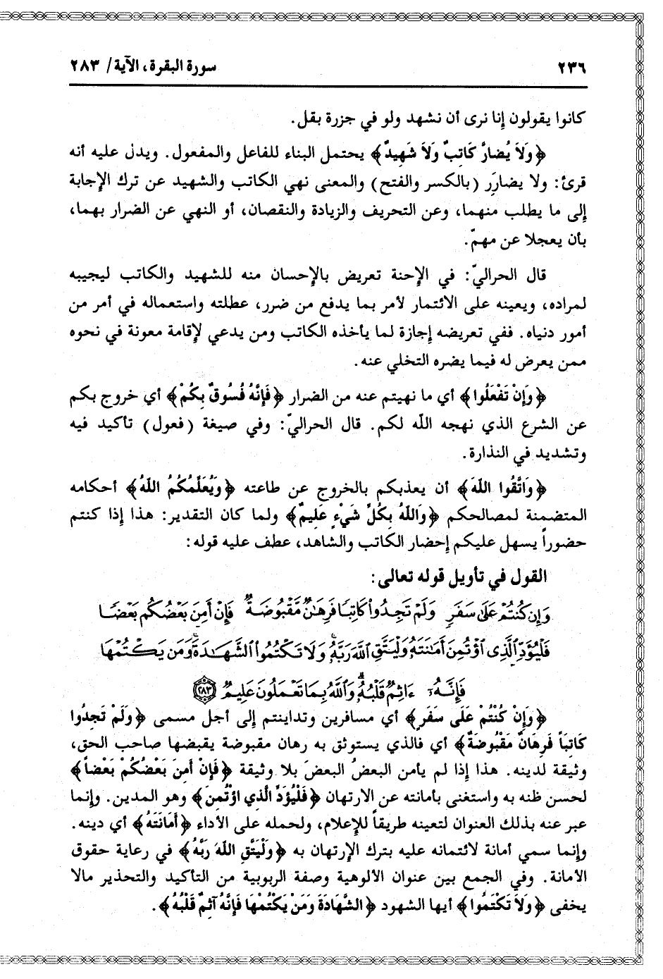 وَإِنْ كُنْتُمْ عَلى سَفَرٍ وَلَمْ تَجِدُوا كاتِباً فَرِهانٌ مَقْبُوضَةٌ فَإِنْ أَمِنَ بَعْضُكُمْ بَعْضاً فَلْيُؤَدِّ الَّذِي اؤْتُمِنَ أَمانَتَهُ وَلْيَتَّقِ اللَّهَ رَبَّهُ وَلا تَكْتُمُوا الشَّهادَةَ وَمَنْ يَكْتُمْها فَإِنَّهُ آثِمٌ قَلْبُهُ وَاللَّهُ بِما تَعْمَلُونَ عَلِيمٌ (283)