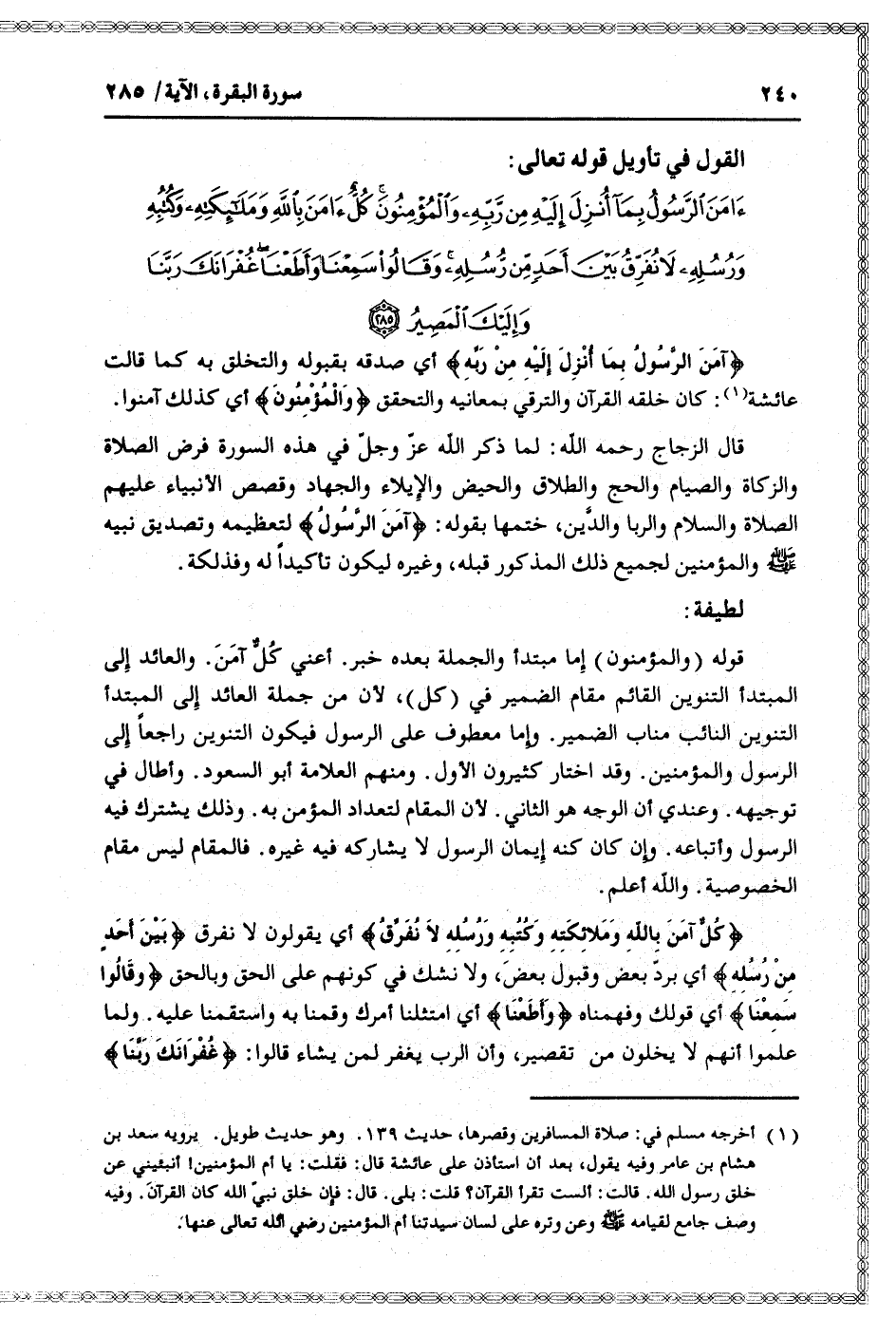 آمَنَ الرَّسُولُ بِما أُنْزِلَ إِلَيْهِ مِنْ رَبِّهِ وَالْمُؤْمِنُونَ كُلٌّ آمَنَ بِاللَّهِ وَمَلائِكَتِهِ وَكُتُبِهِ وَرُسُلِهِ لا نُفَرِّقُ بَيْنَ أَحَدٍ مِنْ رُسُلِهِ وَقالُوا سَمِعْنا وَأَطَعْنا غُفْرانَكَ رَبَّنا وَإِلَيْكَ الْمَصِيرُ (285)