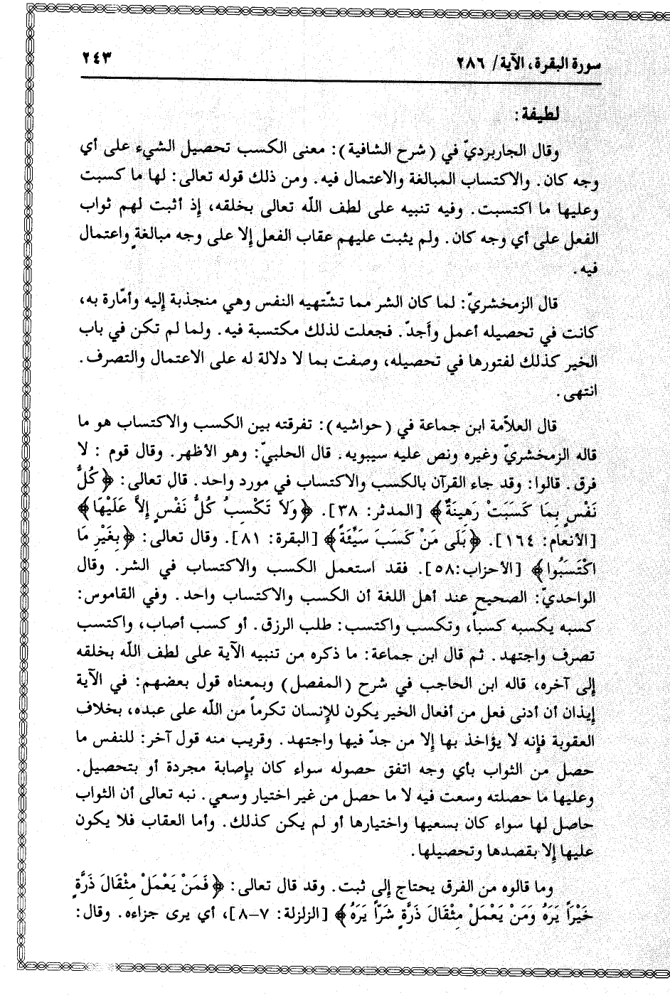 انتهى. قال العلّامة ابن جماعة في (حواشيه) : تفرقته بين الكسب والاكتساب هو ما قاله الزمخشريّ وغيره ونص عليه سيبويه. قال الحلبيّ: وهو الأظهر. وقال قوم: لا فرق. قالوا: وقد جاء القرآن بالكسب والاكتساب في مورد واحد. قال تعالى: كُلُّ نَفْسٍ بِما كَسَبَتْ رَهِينَةٌ [المدثر: 38] . وَلا تَكْسِبُ كُلُّ نَفْسٍ إِلَّا عَلَيْها [الأنعام: 164] . بَلى مَنْ كَسَبَ سَيِّئَةً [البقرة: 81] . وقال تعالى: بِغَيْرِ مَا اكْتَسَبُوا [الأحزاب: 58] . فقد استعمل الكسب والاكتساب في الشر. وقال الواحديّ: الصحيح عند أهل اللغة أن الكسب والاكتساب واحد. وفي القاموس: