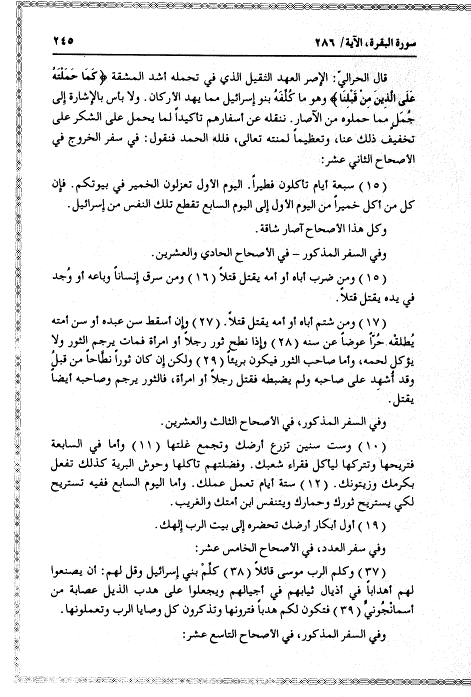 قال الحراليّ: الإصر العهد الثقيل الذي في تحمله أشد المشقة كَما حَمَلْتَهُ عَلَى الَّذِينَ مِنْ قَبْلِنا وهو ما كلّفه بنو إسرائيل مما يهد الأركان. ولا بأس بالإشارة إلى جمل مما حملوه من الآصار. ننقله عن أسفارهم تأكيدا لما يحمل على الشكر على تخفيف ذلك عنا، وتعظيما لمنته تعالى، فلله الحمد فنقول: في سفر الخروج في الأصحاح الثاني عشر: