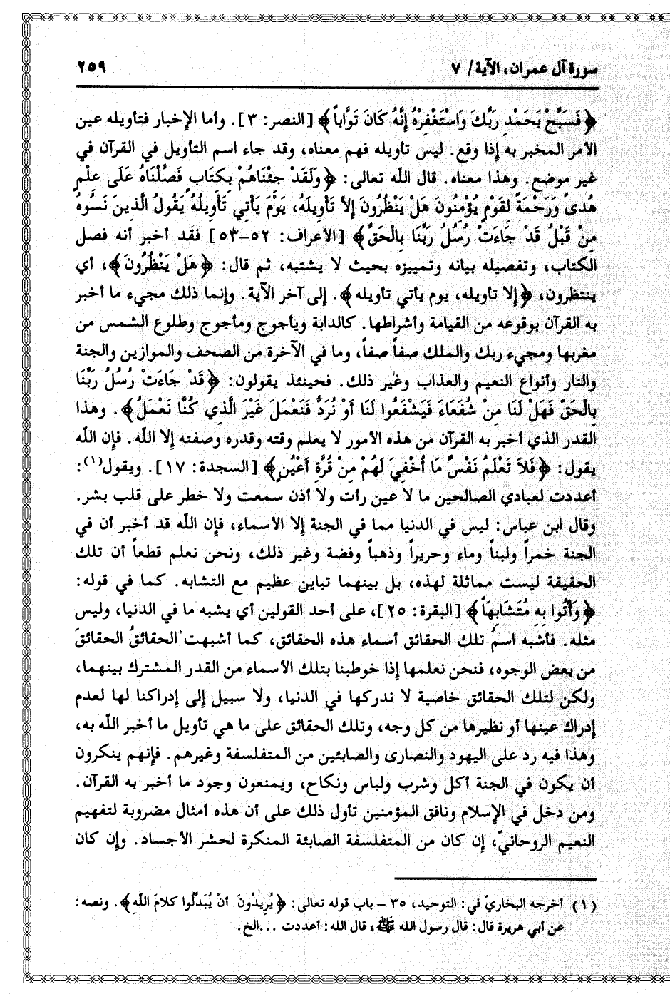 فَسَبِّحْ بِحَمْدِ رَبِّكَ وَاسْتَغْفِرْهُ إِنَّهُ كانَ تَوَّاباً [النصر: 3] . وأما الإخبار فتأويله عين الأمر المخبر به إذا وقع. ليس تأويله فهم معناه، وقد جاء اسم التأويل في القرآن في غير موضع. وهذا معناه. قال الله تعالى: وَلَقَدْ جِئْناهُمْ بِكِتابٍ فَصَّلْناهُ عَلى عِلْمٍ هُدىً وَرَحْمَةً لِقَوْمٍ يُؤْمِنُونَ هَلْ يَنْظُرُونَ إِلَّا تَأْوِيلَهُ، يَوْمَ يَأْتِي تَأْوِيلُهُ يَقُولُ الَّذِينَ نَسُوهُ مِنْ قَبْلُ قَدْ جاءَتْ رُسُلُ رَبِّنا بِالْحَقِّ [الأعراف: 52- 53] فقد أخبر أنه فصل الكتاب، وتفصيله بيانه وتمييزه بحيث لا يشتبه، ثم قال: هَلْ يَنْظُرُونَ، أي ينتظرون، إِلَّا تَأْوِيلَهُ، يَوْمَ يَأْتِي تَأْوِيلُهُ. إلى آخر الآية. وإنما ذلك مجيء ما أخبر به القرآن بوقوعه من القيامة وأشراطها. كالدابة ويأجوج ومأجوج وطلوع الشمس من مغربها ومجيء ربك والملك صفا صفا، وما في الآخرة من الصحف والموازين والجنة والنار وأنواع النعيم والعذاب وغير ذلك. فحينئذ يقولون: قَدْ جاءَتْ رُسُلُ رَبِّنا بِالْحَقِّ فَهَلْ لَنا مِنْ شُفَعاءَ فَيَشْفَعُوا لَنا أَوْ نُرَدُّ فَنَعْمَلَ غَيْرَ الَّذِي كُنَّا نَعْمَلُ. وهذا القدر الذي أخبر به القرآن من هذه الأمور لا يعلم وقته وقدره وصفته إلا الله. فإن الله يقول: فَلا تَعْلَمُ نَفْسٌ ما أُخْفِيَ لَهُمْ مِنْ قُرَّةِ أَعْيُنٍ [السجدة: 17] . ويقول «1» :