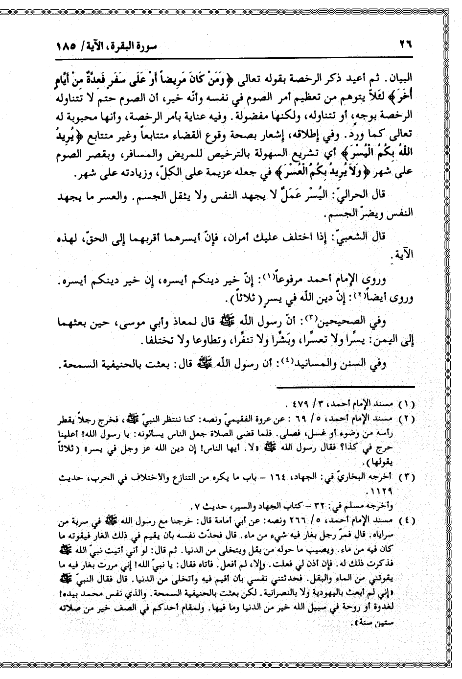 البيان. ثم أعيد ذكر الرخصة بقوله تعالى وَمَنْ كانَ مَرِيضاً أَوْ عَلى سَفَرٍ فَعِدَّةٌ مِنْ أَيَّامٍ أُخَرَ لئلّا يتوهم من تعظيم أمر الصوم في نفسه وأنّه خير، أن الصوم حتم لا تتناوله الرخصة بوجه، أو تتناوله، ولكنها مفضولة. وفيه عناية بأمر الرخصة، وأنها محبوبة له تعالى كما ورد. وفي إطلاقه، إشعار بصحة وقوع القضاء متتابعا وغير متتابع يُرِيدُ اللَّهُ بِكُمُ الْيُسْرَ أي تشريع السهولة بالترخيص للمريض والمسافر، وبقصر الصوم على شهر وَلا يُرِيدُ بِكُمُ الْعُسْرَ في جعله عزيمة على الكلّ، وزيادته على شهر.