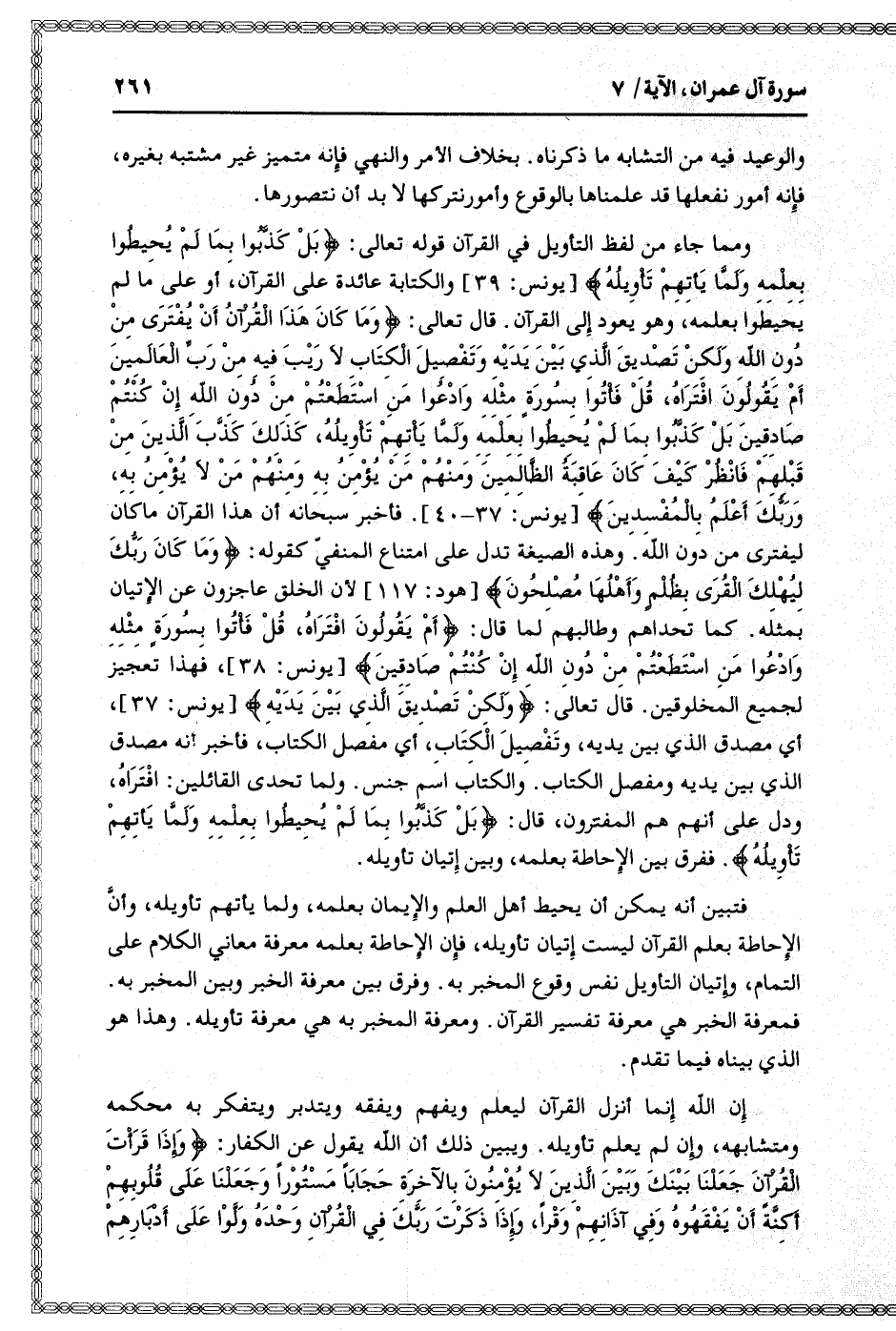 ومما جاء من لفظ التأويل في القرآن قوله تعالى: بَلْ كَذَّبُوا بِما لَمْ يُحِيطُوا بِعِلْمِهِ وَلَمَّا يَأْتِهِمْ تَأْوِيلُهُ [يونس: 39] والكتابة عائدة على القرآن، أو على ما لم يحيطوا بعلمه، وهو يعود إلى القرآن. قال تعالى: وَما كانَ هذَا الْقُرْآنُ أَنْ يُفْتَرى مِنْ دُونِ اللَّهِ وَلكِنْ تَصْدِيقَ الَّذِي بَيْنَ يَدَيْهِ وَتَفْصِيلَ الْكِتابِ لا رَيْبَ فِيهِ مِنْ رَبِّ الْعالَمِينَ أَمْ يَقُولُونَ افْتَراهُ، قُلْ فَأْتُوا بِسُورَةٍ مِثْلِهِ وَادْعُوا مَنِ اسْتَطَعْتُمْ مِنْ دُونِ اللَّهِ إِنْ كُنْتُمْ صادِقِينَ بَلْ كَذَّبُوا بِما لَمْ يُحِيطُوا بِعِلْمِهِ وَلَمَّا يَأْتِهِمْ تَأْوِيلُهُ، كَذلِكَ كَذَّبَ الَّذِينَ مِنْ قَبْلِهِمْ فَانْظُرْ كَيْفَ كانَ عاقِبَةُ الظَّالِمِينَ وَمِنْهُمْ مَنْ يُؤْمِنُ بِهِ وَمِنْهُمْ مَنْ لا يُؤْمِنُ بِهِ، وَرَبُّكَ أَعْلَمُ بِالْمُفْسِدِينَ [يونس: 37- 40] . فأخبر سبحانه أن هذا القرآن ما كان ليفترى من دون الله. وهذه الصيغة تدل على امتناع المنفيّ كقوله: وَما كانَ رَبُّكَ لِيُهْلِكَ الْقُرى بِظُلْمٍ وَأَهْلُها مُصْلِحُونَ [هود: 117] لأن الخلق عاجزون عن الإتيان بمثله. كما تحداهم وطالبهم لما قال: أَمْ يَقُولُونَ افْتَراهُ، قُلْ فَأْتُوا بِسُورَةٍ مِثْلِهِ وَادْعُوا مَنِ اسْتَطَعْتُمْ مِنْ دُونِ اللَّهِ إِنْ كُنْتُمْ صادِقِينَ [يونس: 38] ، فهذا تعجيز لجميع المخلوقين. قال تعالى: وَلكِنْ تَصْدِيقَ الَّذِي بَيْنَ يَدَيْهِ [يونس: 37] ، أي مصدق الذي بين يديه، وتفصيل الكتاب، أي مفصل الكتاب، فأخبر أنه مصدق الذي بين يديه ومفصل الكتاب. والكتاب اسم جنس. ولما تحدى القائلين: افتراه، ودل على أنهم هم المفترون، قال: بَلْ كَذَّبُوا بِما لَمْ يُحِيطُوا بِعِلْمِهِ وَلَمَّا يَأْتِهِمْ تَأْوِيلُهُ. ففرق بين الإحاطة بعلمه، وبين إتيان تأويله.