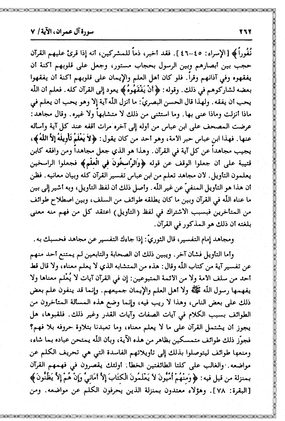 عرضت المصحف على ابن عباس من أوله إلى آخره مرات أقفه عند كل آية وأسأله عنها. فهذا ابن عباس حبر الأمة، وهو أحد من كان يقول: وَما يَعْلَمُ تَأْوِيلَهُ إِلَّا اللَّهُ، يجيب مجاهدا عن كل آية في القرآن. وهذا هو الذي جعل مجاهدا ومن وافقه كابن قتيبة على أن جعلوا الوقف عن قوله وَالرَّاسِخُونَ فِي الْعِلْمِ فجعلوا الراسخين يعلمون التأويل. لأن مجاهد تعلم من ابن عباس تفسير القرآن كله وبيان معانيه. فظن أن هذا هو التأويل المنفيّ عن غير الله. وأصل ذلك أن لفظ التأويل، وبه أشير إلى بين ما عناه الله في القرآن وبين ما كان يطلقه طوائف من السلف، وبين اصطلاح طوائف من المتأخرين فبسبب الاشتراك في لفظ (التأويل) اعتقد كل من فهم منه معنى بلغته أن ذلك هو المذكور في القرآن.
