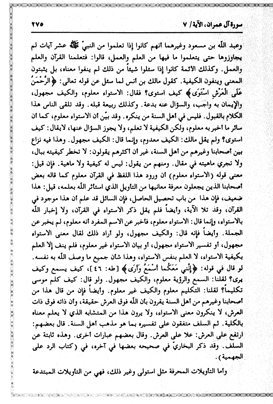 وعبد الله بن مسعود وغيرهما أنهم كانوا إذا تعلموا من النبيّ صلى الله عليه وسلم عشر آيات لم يجاوزوها حتى يتعلموا ما فيها من العلم والعمل، قالوا: فتعلمنا القرآن والعلم والعمل. وكذلك الأئمة كانوا إذا سئلوا شيئا من ذلك لم ينفوا معناه، بل يثبتون المعنى وينفون الكيفية. كقول مالك بن أنس لما سئل عن قوله تعالى: الرَّحْمنُ عَلَى الْعَرْشِ اسْتَوى كيف استوى؟ فقال: الاستواء معلوم، والكيف مجهول، والإيمان به واجب، والسؤال عنه بدعة. وكذلك ربيعة قبله. وقد تلقى الناس هذا الكلام بالقبول. فليس في أهل السنة من ينكره. وقد بيّن أن الاستواء معلوم، كما أن سائر ما أخبر به معلوم، ولكن الكيفية لا تعلم، ولا يجوز السؤال عنها، لا يقال: كيف استوى؟ ولم يقل مالك: الكيف معدوم، وإنما قال: الكيف مجهول. وهذا فيه نزاع بين أصحابنا وغيرهم من أهل السنة، غير أن أكثرهم يقولون: لا تخطر كيفيته ببال، ولا تجري ماهيته في مقال. ومنهم من يقول: ليس له كيفية ولا ماهية. فإن قيل: