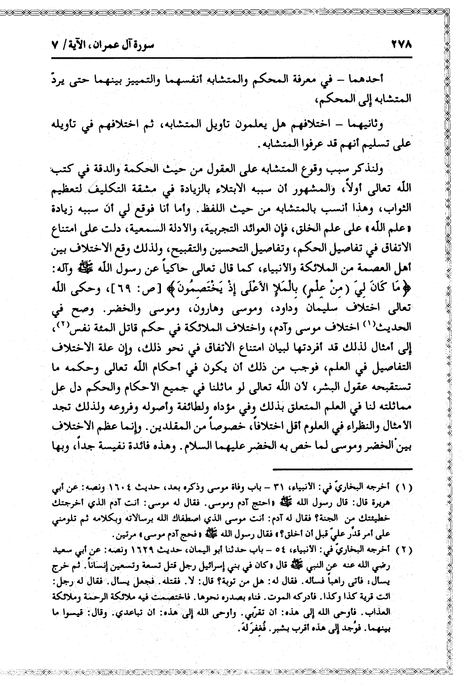 ما كانَ لِي (مِنْ عِلْمٍ) بِالْمَلَإِ الْأَعْلى إِذْ يَخْتَصِمُونَ [ص: 69] ، وحكى الله تعالى اختلاف سليمان وداود، وموسى وهارون، وموسى والخضر. وصح في الحديث «1» اختلاف موسى وآدم، واختلاف الملائكة في حكم قاتل المائة نفس «2» ، إلى أمثال لذلك قد أفردتها لبيان امتناع الاتفاق في نحو ذلك، وإن علة الاختلاف التفاصيل في العلم، فوجب من ذلك أن يكون في أحكام الله تعالى وحكمه ما تستقبحه عقول البشر، لأن الله تعالى لو ماثلنا في جميع الأحكام والحكم دل على مماثلته لنا في العلم المتعلق بذلك وفي مؤداه ولطائفة وأصوله وفروعه ولذلك تجد الأمثال والنظراء في العلوم أقل اختلافا، خصوصا من المقلدين. وإنما عظم الاختلاف بين الخضر وموسى لما خص به الخضر عليهما السلام. وهذه فائدة نفيسة جدا، وبها