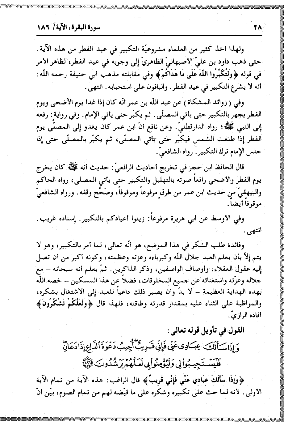وَإِذا سَأَلَكَ عِبادِي عَنِّي فَإِنِّي قَرِيبٌ قال الراغب: هذه الآية من تمام الآية الأولى. لأنه لما حث على تكبيره وشكره على ما قيّضه لهم من تمام الصوم، بيّن أنّ