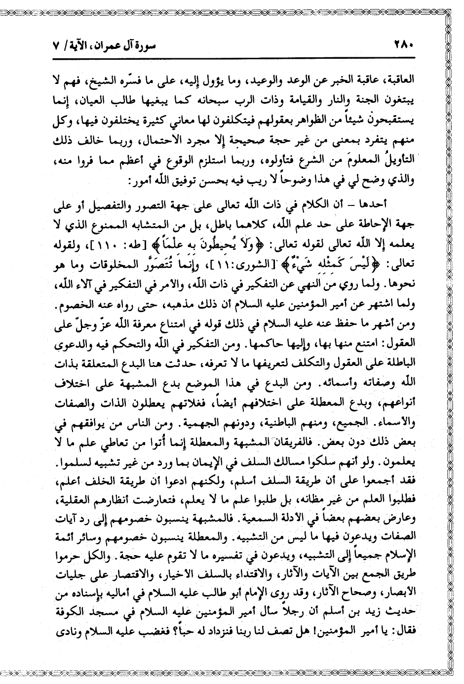 فقد أجمعوا على أن طريقة السلف أسلم، ولكنهم ادعوا أن طريقة الخلف أعلم، فطلبوا العلم من غير مظانه، بل طلبوا علم ما لا يعلم، فتعارضت أنظارهم العقلية، وعارض بعضهم بعضا في الأدلة السمعية. فالمشبهة ينسبون خصومهم إلى رد آيات الصفات ويدعون فيها ما ليس من التشبيه. والمعطلة ينسبون خصومهم وسائر أئمة الإسلام جميعا إلى التشبيه، ويدعون في تفسيره ما لا تقوم عليه حجة. والكل حرموا طريق الجمع بين الآيات والآثار، والاقتداء بالسلف الأخيار، والاقتصار على جليات الأبصار، وصحاح الآثار، وقد روى الإمام أبو طالب عليه السلام في أماليه بإسناده من حديث زيد بن أسلم أن رجلا سأل أمير المؤمنين عليه السلام في مسجد الكوفة فقال: يا أمير المؤمنين! هل تصف لنا ربنا فنزداد له حبا؟ فغضب عليه السلام ونادى