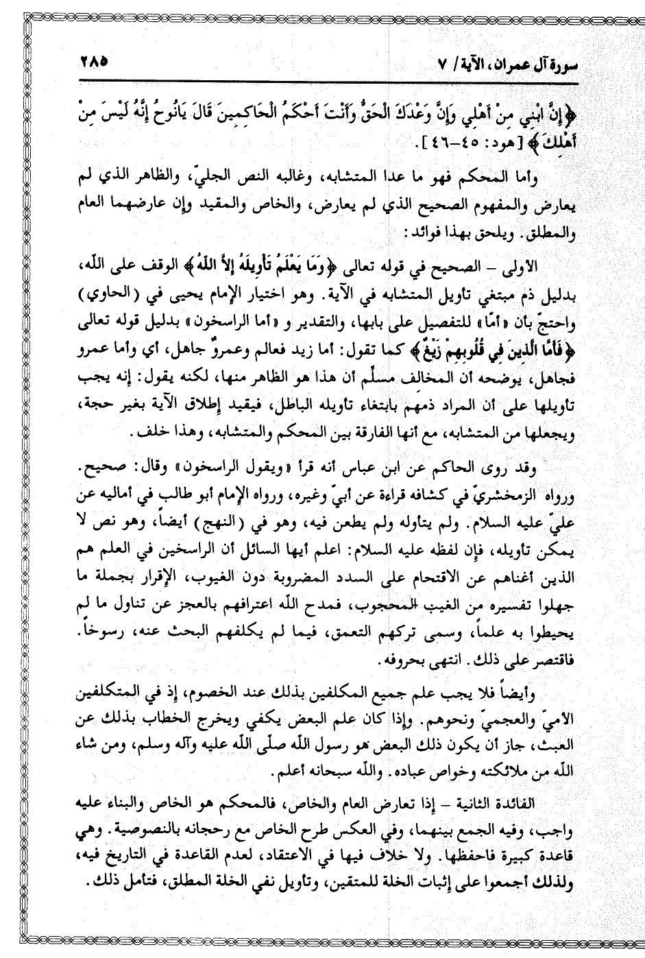 الأولى- الصحيح في قوله تعالى وَما يَعْلَمُ تَأْوِيلَهُ إِلَّا اللَّهُ الوقف على الله، بدليل ذم مبتغي تأويل المتشابه في الآية. وهو اختيار الإمام يحيى في (الحاوي) واحتجّ بأن «أمّا» للتفصيل على بابها، والتقدير و «أما الراسخون» بدليل قوله تعالى فَأَمَّا الَّذِينَ فِي قُلُوبِهِمْ زَيْغٌ كما تقول: أما زيد فعالم وعمرو جاهل، أي وأما عمرو فجاهل، يوضحه أن المخالف مسلّم أن هذا هو الظاهر منها، لكنه يقول: إنه يجب تأويلها على أن المراد ذمهم بابتغاء تأويله الباطل، فيقيد إطلاق الآية بغير حجة، ويجعلها من المتشابه، مع أنها الفارقة بين المحكم والمتشابه، وهذا خلف.