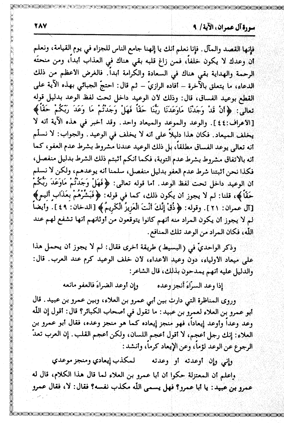 وروى المناظرة التي دارت بين أبي عمرو بن العلاء، وبين عمرو بن عبيد. قال أبو عمرو بن العلاء لعمرو بن عبيد: ما تقول في أصحاب الكبائر؟ قال: أقول إن الله وعد وعدا وأوعد إيعادا، فهو منجز إيعاده كما هو منجز وعده، فقال أبو عمرو بن العلاء: إنك رجل أعجم، لا أقول أعجم اللسان، ولكن أعجم القلب. إن العرب تعدّ الرجوع عن الوعد لؤما، وعن الإيعاد كرما، وأنشد: