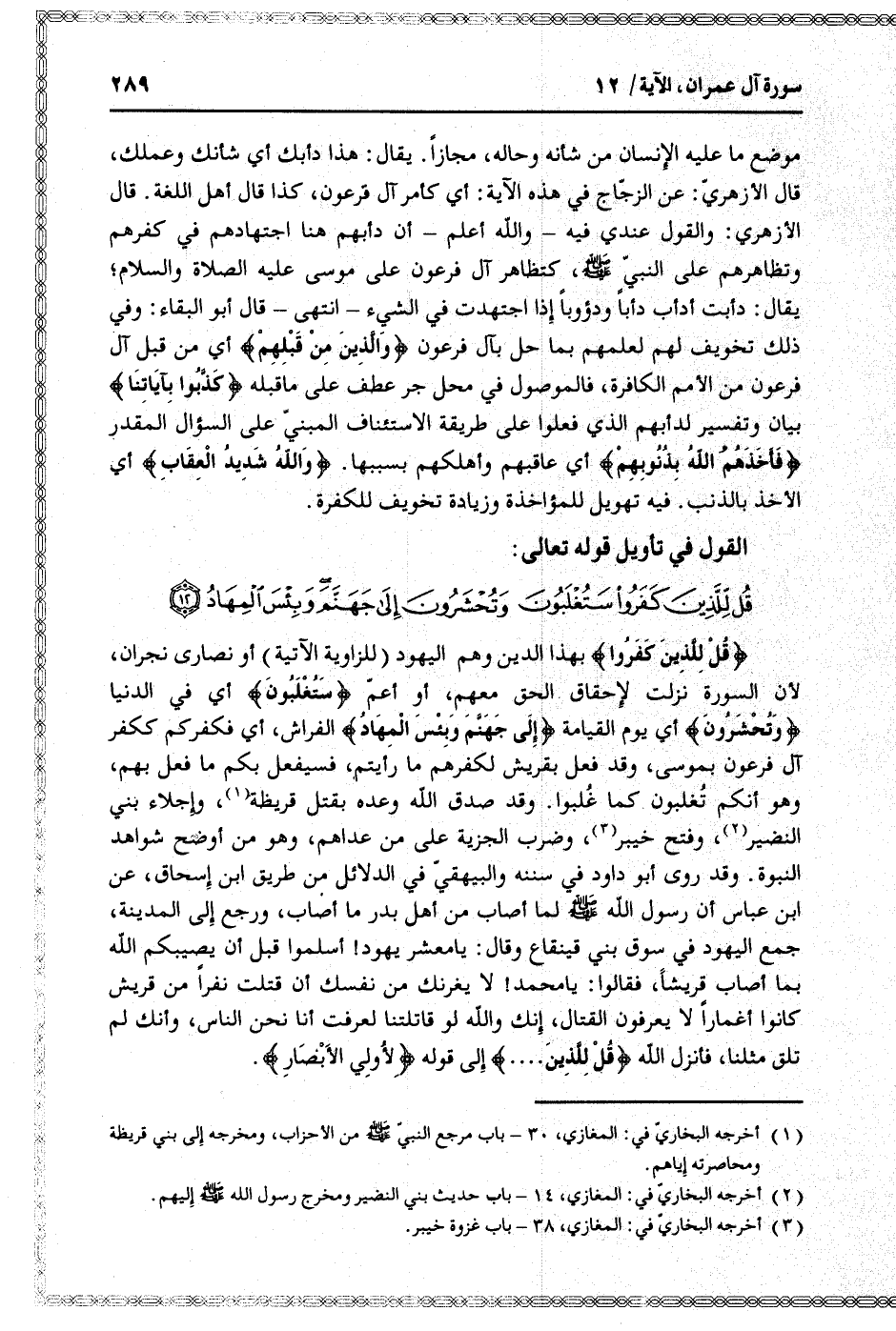 قُلْ لِلَّذِينَ كَفَرُوا بهذا الدين وهم اليهود (للزاوية الآتية) أو نصارى نجران، لأن السورة نزلت لإحقاق الحق معهم، أو أعمّ سَتُغْلَبُونَ أي في الدنيا وَتُحْشَرُونَ أي يوم القيامة إِلى جَهَنَّمَ وَبِئْسَ الْمِهادُ الفراش، أي فكفركم ككفر آل فرعون بموسى، وقد فعل بقريش لكفرهم ما رأيتم، فسيفعل بكم ما فعل بهم، وهو أنكم تغلبون كما غلبوا. وقد صدق الله وعده بقتل قريظة «1» ، وإجلاء بني النضير «2» ، وفتح خيبر «3» ، وضرب الجزية على من عداهم، وهو من أوضح شواهد النبوة.