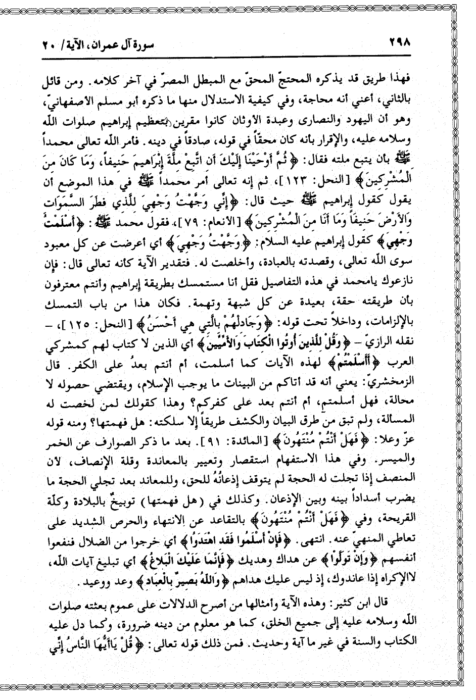 فهذا طريق قد يذكره المحتجّ المحقّ مع المبطل المصرّ في آخر كلامه. ومن قائل بالثاني، أعني أنه محاجة، وفي كيفية الاستدلال منها ما ذكره أبو مسلم الأصفهانيّ، وهو أن اليهود والنصارى وعبدة الأوثان كانوا مقرين بتعظيم إبراهيم صلوات الله وسلامه عليه، والإقرار بأنه كان محقّا في قوله، صادقا في دينه. فأمر الله تعالى محمدا صلّى الله عليه وسلم بأن يتبع ملته فقال: ثُمَّ أَوْحَيْنا إِلَيْكَ أَنِ اتَّبِعْ مِلَّةَ إِبْراهِيمَ حَنِيفاً، وَما كانَ مِنَ الْمُشْرِكِينَ [النحل: 123] ، ثم إنه تعالى أمر محمدا صلى الله عليه وسلم في هذا الموضع أن يقول كقول إبراهيم صلّى الله عليه وسلم حيث قال: إِنِّي وَجَّهْتُ وَجْهِيَ لِلَّذِي فَطَرَ السَّماواتِ وَالْأَرْضَ حَنِيفاً وَما أَنَا مِنَ الْمُشْرِكِينَ [الأنعام: 79] ، فقول محمد صلّى الله عليه وسلم: أَسْلَمْتُ وَجْهِيَ كقول إبراهيم عليه السلام: وَجَّهْتُ وَجْهِيَ أي أعرضت عن كل معبود سوى الله تعالى، وقصدته بالعبادة، وأخلصت له. فتقدير الآية كأنه تعالى قال: فإن نازعوك يا محمد في هذه التفاصيل فقل أنا مستمسك بطريقة إبراهيم وأنتم معترفون بأن طريقته حقة، بعيدة عن كل شبهة وتهمة. فكان هذا من باب التمسك بالإلزامات، وداخلا تحت قوله: وَجادِلْهُمْ بِالَّتِي هِيَ أَحْسَنُ [النحل: 125] ، - نقله الرازيّ- وَقُلْ لِلَّذِينَ أُوتُوا الْكِتابَ وَالْأُمِّيِّينَ أي الذين لا كتاب لهم كمشركي العرب أَأَسْلَمْتُمْ لهذه الآيات كما أسلمت، أم أنتم بعد على الكفر. قال الزمخشريّ: يعني أنه قد أتاكم من البينات ما يوجب الإسلام، ويقتضي حصوله لا محالة، فهل أسلمتم، أم أنتم بعد على كفركم؟ وهذا كقولك لمن لخصت له المسألة، ولم تبق من طرق البيان والكشف طريقا إلا سلكته: هل فهمتها؟ ومنه قوله عزّ وعلا: فَهَلْ أَنْتُمْ مُنْتَهُونَ [المائدة: 91] . بعد ما ذكر الصوارف عن الخمر والميسر. وفي هذا الاستفهام استقصار وتعيير بالمعاندة وقلة الإنصاف، لأن المنصف إذا تجلت له الحجة لم يتوقف إذعانه للحق، وللمعاند بعد تجلي الحجة ما يضرب أسدادا بينه وبين الإذعان. وكذلك في (هل فهمتها) توبيخ بالبلادة وكلّة القريحة، وفي فَهَلْ أَنْتُمْ مُنْتَهُونَ بالتقاعد عن الانتهاء والحرص الشديد على تعاطي المنهيّ عنه. انتهى. فَإِنْ أَسْلَمُوا فَقَدِ اهْتَدَوْا أي خرجوا من الضلال فنفعوا أنفسهم وَإِنْ تَوَلَّوْا عن هداك وهديك فَإِنَّما عَلَيْكَ الْبَلاغُ أي تبليغ آيات الله، لا الإكراه إذا عاندوك، إذ ليس عليك هداهم وَاللَّهُ بَصِيرٌ بِالْعِبادِ وعد ووعيد.