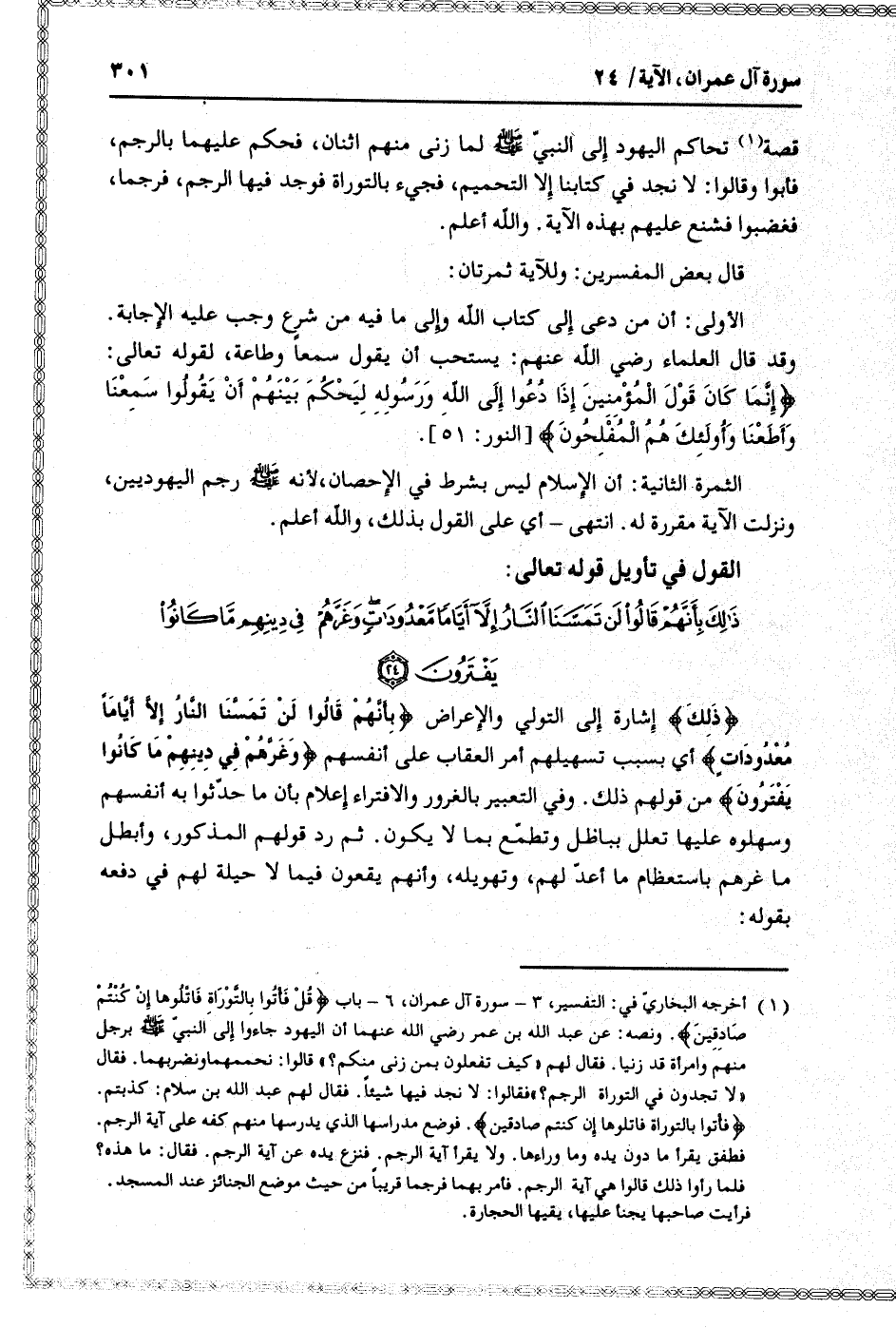 أخرجه البخاريّ في: التفسير، 3- سورة آل عمران، 6- باب قُلْ فَأْتُوا بِالتَّوْراةِ فَاتْلُوها إِنْ كُنْتُمْ صادِقِينَ. ونصه: عن عبد الله بن عمر رضي الله عنهما أن اليهود جاءوا إلى النبيّ صلّى الله عليه وسلم برجل منهم وامرأة قد زنيا. فقال لهم «كيف تفعلون بمن زنى منكم؟» قالوا: نحممهما ونضربهما. فقال «لا تجدون في التوراة الرجم؟» فقالوا: لا نجد فيها شيئا. فقال لهم عبد الله بن سلام: كذبتم.