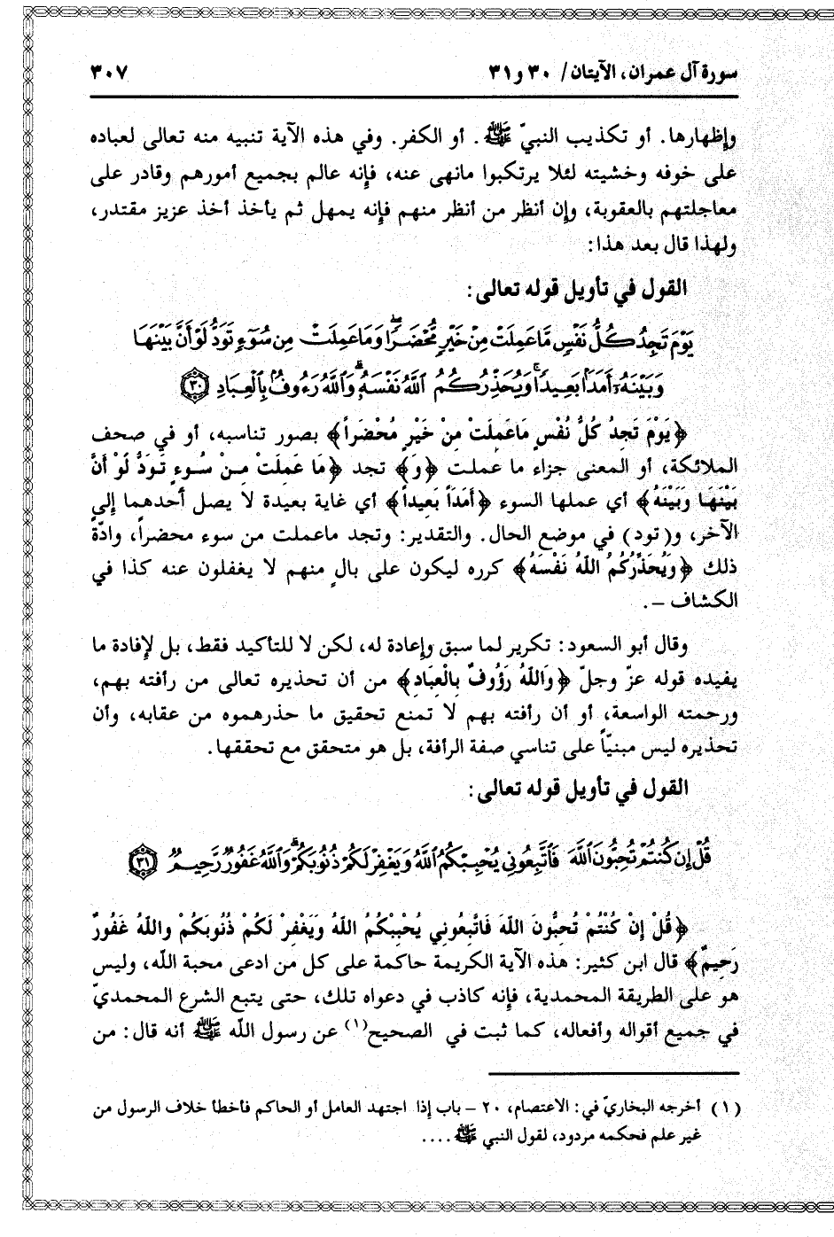يَوْمَ تَجِدُ كُلُّ نَفْسٍ ما عَمِلَتْ مِنْ خَيْرٍ مُحْضَراً وَما عَمِلَتْ مِنْ سُوءٍ تَوَدُّ لَوْ أَنَّ بَيْنَها وَبَيْنَهُ أَمَداً بَعِيداً وَيُحَذِّرُكُمُ اللَّهُ نَفْسَهُ وَاللَّهُ رَؤُفٌ بِالْعِبادِ (30)