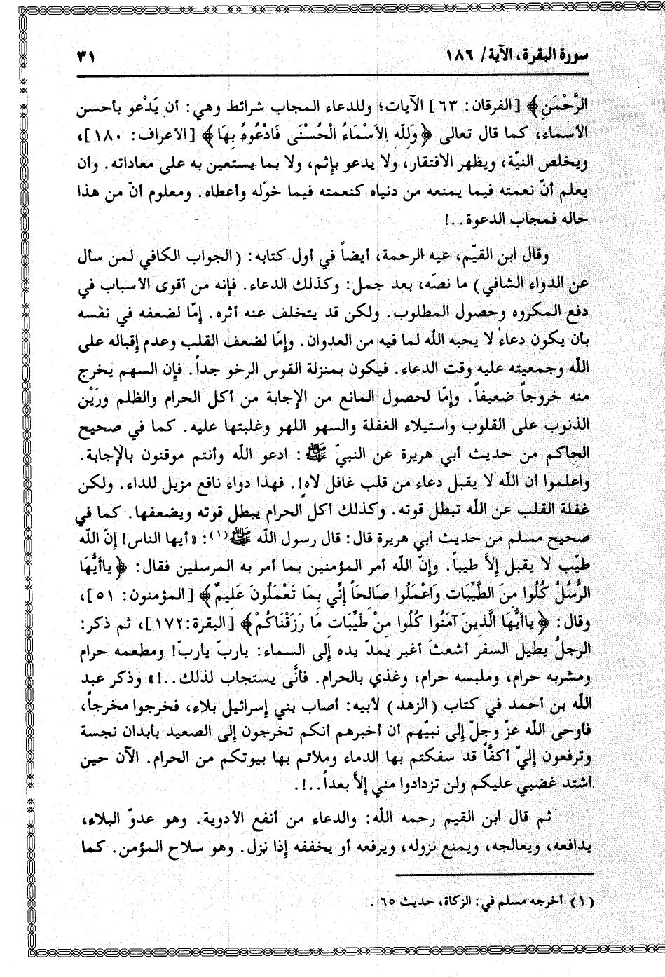 وقال ابن القيّم، عليه الرحمة، أيضا في أول كتابه: (الجواب الكافي لمن سأل عن الدواء الشافي) ما نصّه، بعد جمل: وكذلك الدعاء. فإنه من أقوى الأسباب في دفع المكروه وحصول المطلوب. ولكن قد يتخلف عنه أثره. إمّا لضعفه في نفسه بأن يكون دعاء لا يحبه الله لما فيه من العدوان. وإمّا لضعف القلب وعدم إقباله على الله وجمعيته عليه وقت الدعاء. فيكون بمنزلة القوس الرخو جدا. فإن السهم يخرج منه خروجا ضعيفا. وإمّا لحصول المانع من الإجابة من أكل الحرام والظلم ورين الذنوب على القلوب واستيلاء الغفلة والسهو اللهو وغلبتها عليه. كما