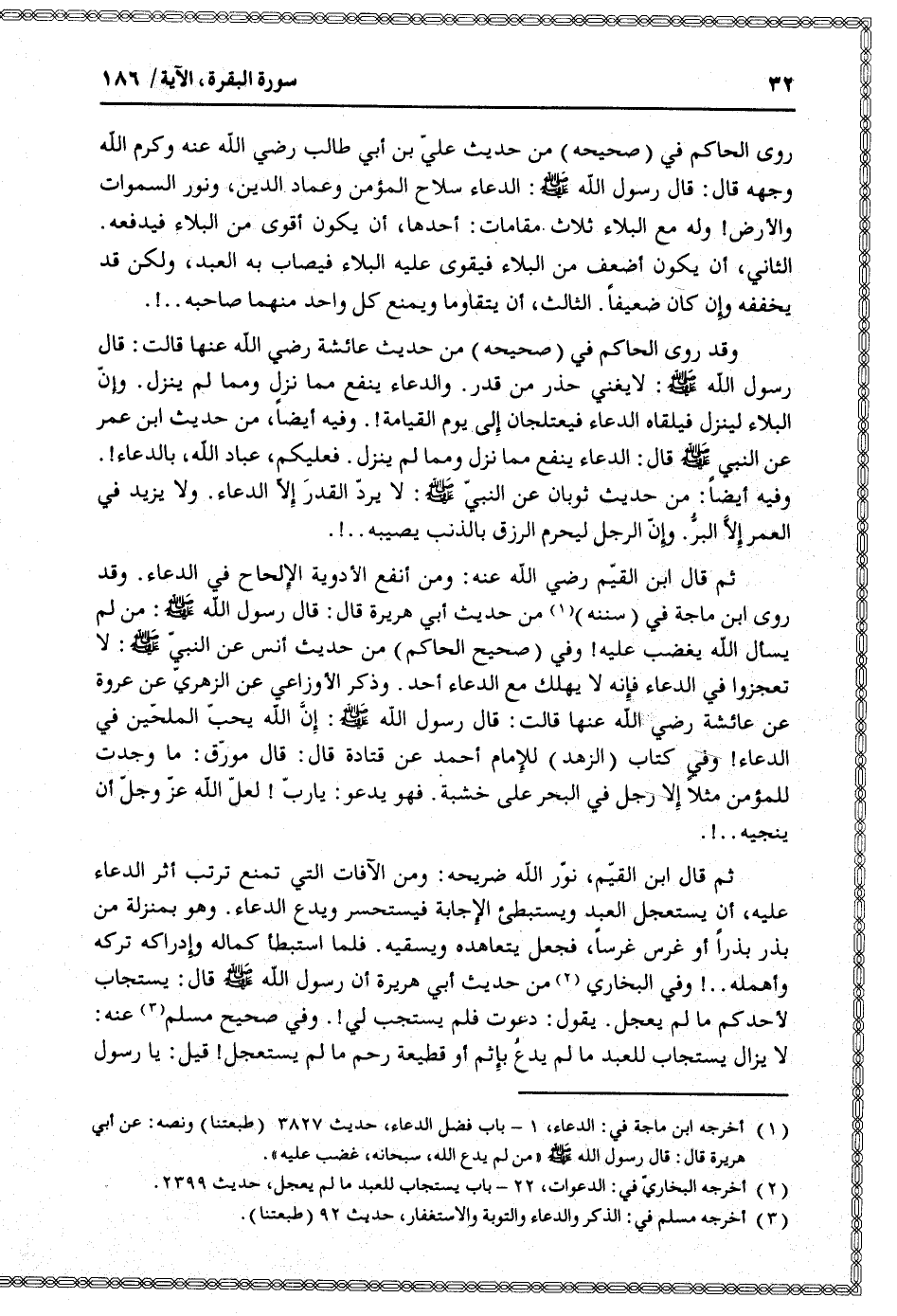 روى الحاكم في (صحيحه) من حديث عليّ بن أبي طالب رضي الله عنه وكرم الله وجهه قال: قال رسول الله صلّى الله عليه وسلّم: الدعاء سلاح المؤمن وعماد الدين، ونور السموات والأرض! وله مع البلاء ثلاث مقامات: أحدها، أن يكون أقوى من البلاء فيدفعه.