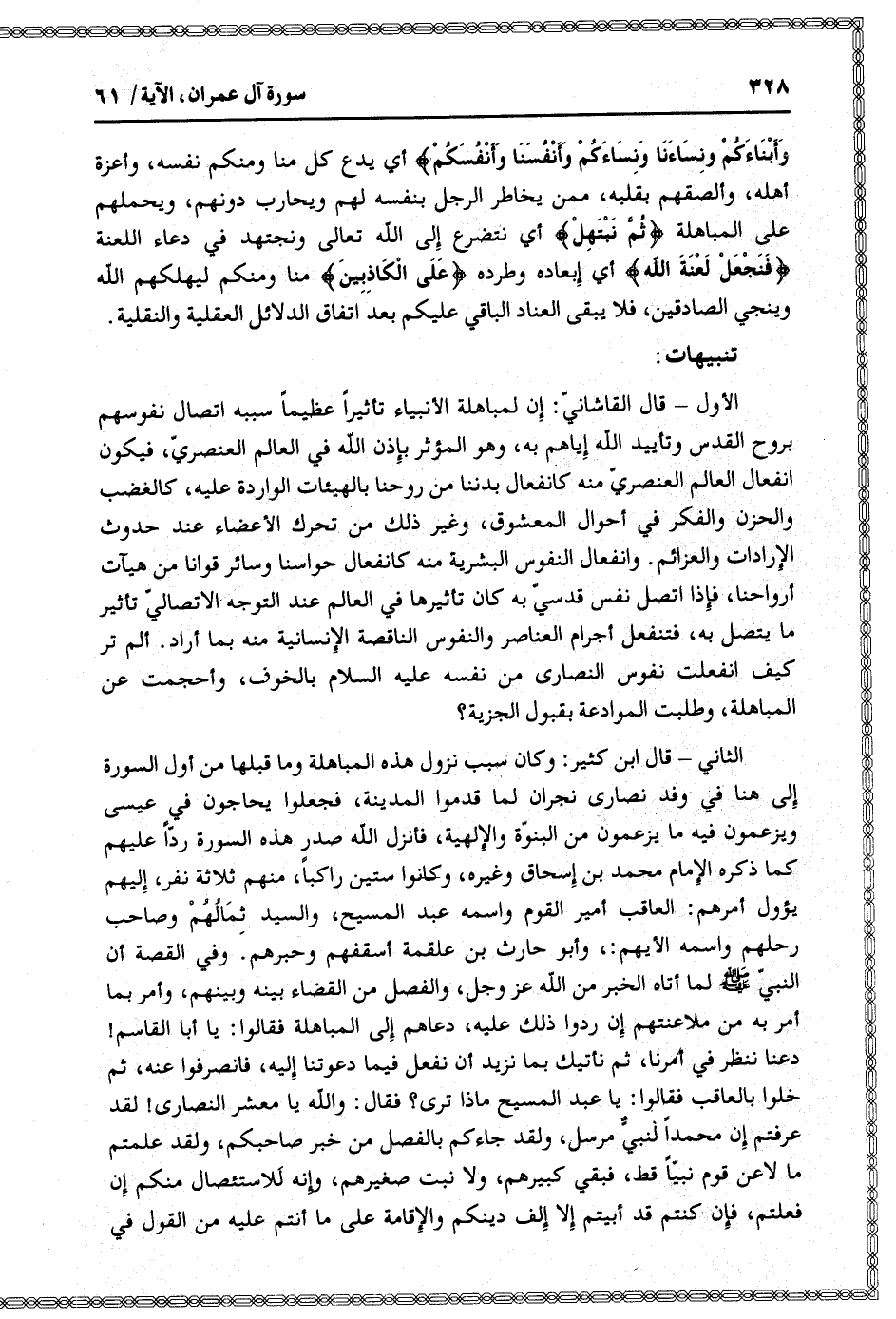 الأول- قال القاشانيّ: إن لمباهلة الأنبياء تأثيرا عظيما سببه اتصال نفوسهم بروح القدس وتأييد الله إياهم به، وهو المؤثر بإذن الله في العالم العنصريّ، فيكون انفعال العالم العنصريّ منه كانفعال بدننا من روحنا بالهيئات الواردة عليه، كالغضب والحزن والفكر في أحوال المعشوق، وغير ذلك من تحرك الأعضاء عند حدوث الإرادات والعزائم. وانفعال النفوس البشرية منه كانفعال حواسنا وسائر قوانا من هيآت أرواحنا، فإذا اتصل نفس قدسيّ به كان تأثيرها في العالم عند التوجه الاتصاليّ تأثير ما يتصل به، فتنفعل أجرام العناصر والنفوس الناقصة الإنسانية منه بما أراد. ألم تر كيف انفعلت نفوس النصارى من نفسه عليه السلام بالخوف، وأحجمت عن المباهلة، وطلبت الموادعة بقبول الجزية؟