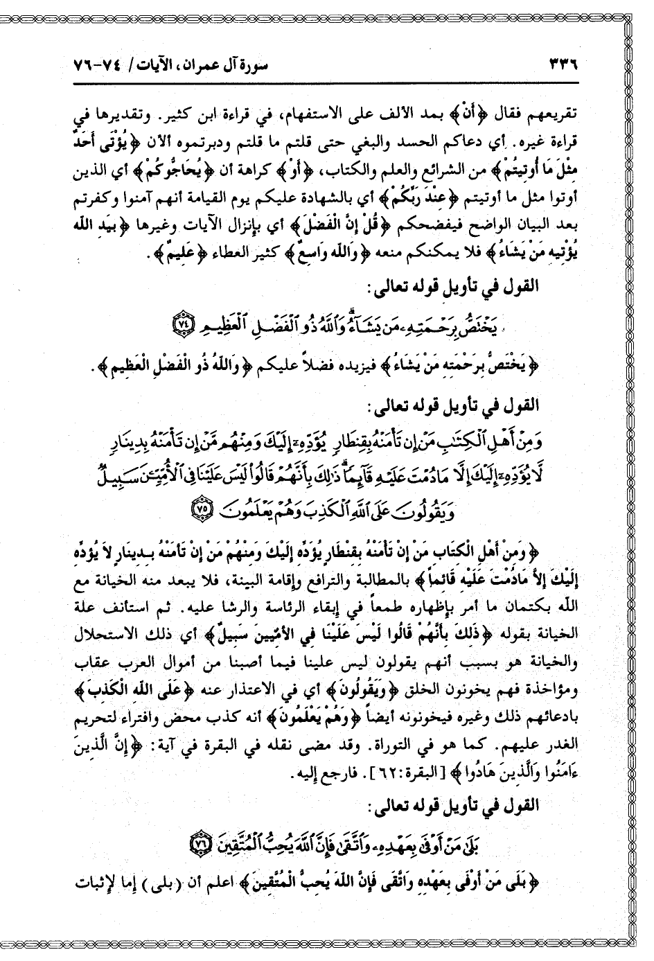 وَمِنْ أَهْلِ الْكِتابِ مَنْ إِنْ تَأْمَنْهُ بِقِنْطارٍ يُؤَدِّهِ إِلَيْكَ وَمِنْهُمْ مَنْ إِنْ تَأْمَنْهُ بِدِينارٍ لا يُؤَدِّهِ إِلَيْكَ إِلاَّ ما دُمْتَ عَلَيْهِ قائِماً ذلِكَ بِأَنَّهُمْ قالُوا لَيْسَ عَلَيْنا فِي الْأُمِّيِّينَ سَبِيلٌ وَيَقُولُونَ عَلَى اللَّهِ الْكَذِبَ وَهُمْ يَعْلَمُونَ (75)